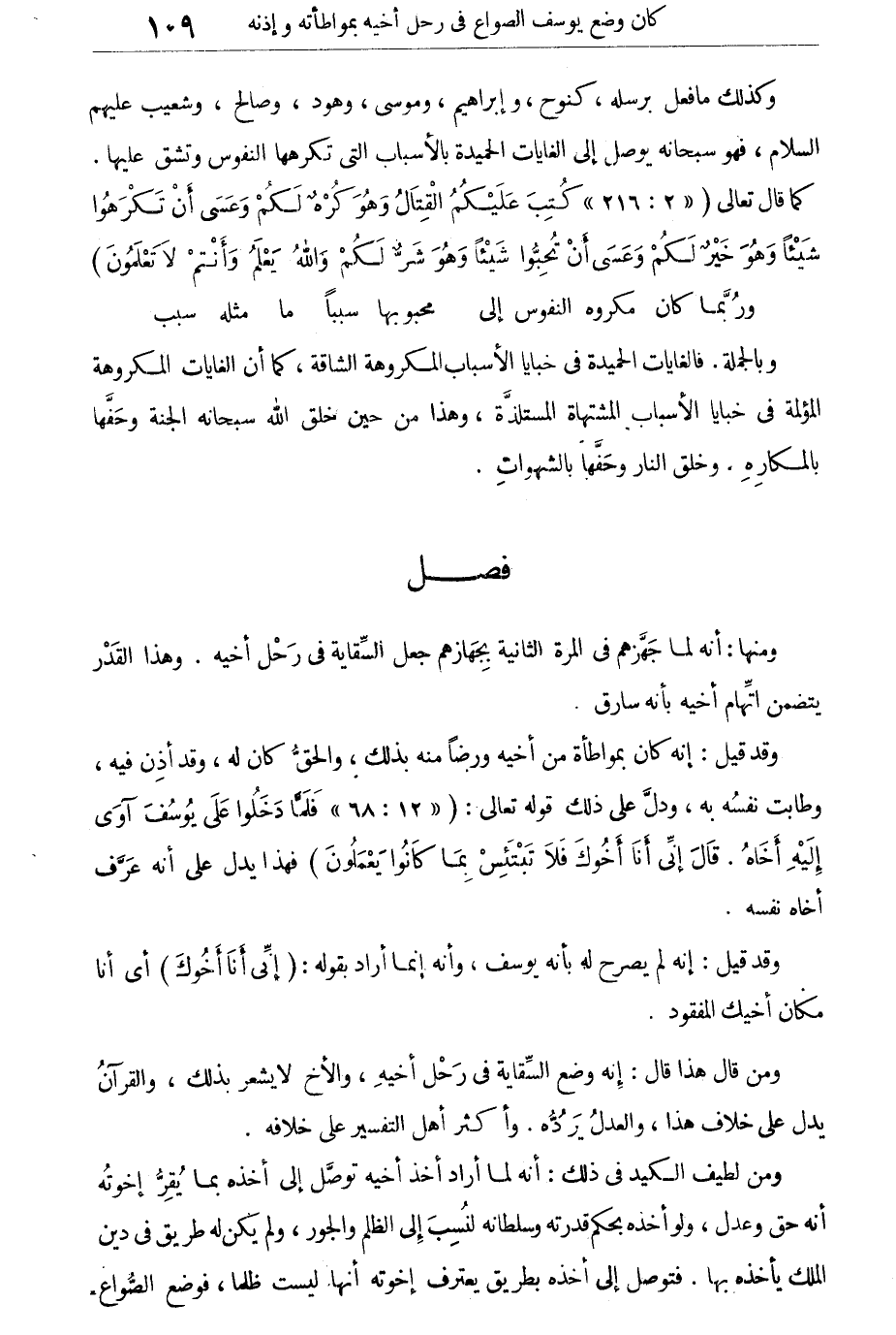 ومن لطيف الكيد فى ذلك: أنه لما أراد أخذ أخيه توصل إلى أخذه بما يقر إخوته أنه حق وعدل، ولو أخذه بحكم قدرته وسلطانه لنسب إلى الظلم والجور، ولم يكن له طريق فى دين الملك يأخذه بها. فتوصل إلى أخذه بطريق يعترف إخوته أنها ليست ظلما، فوضع الصواع