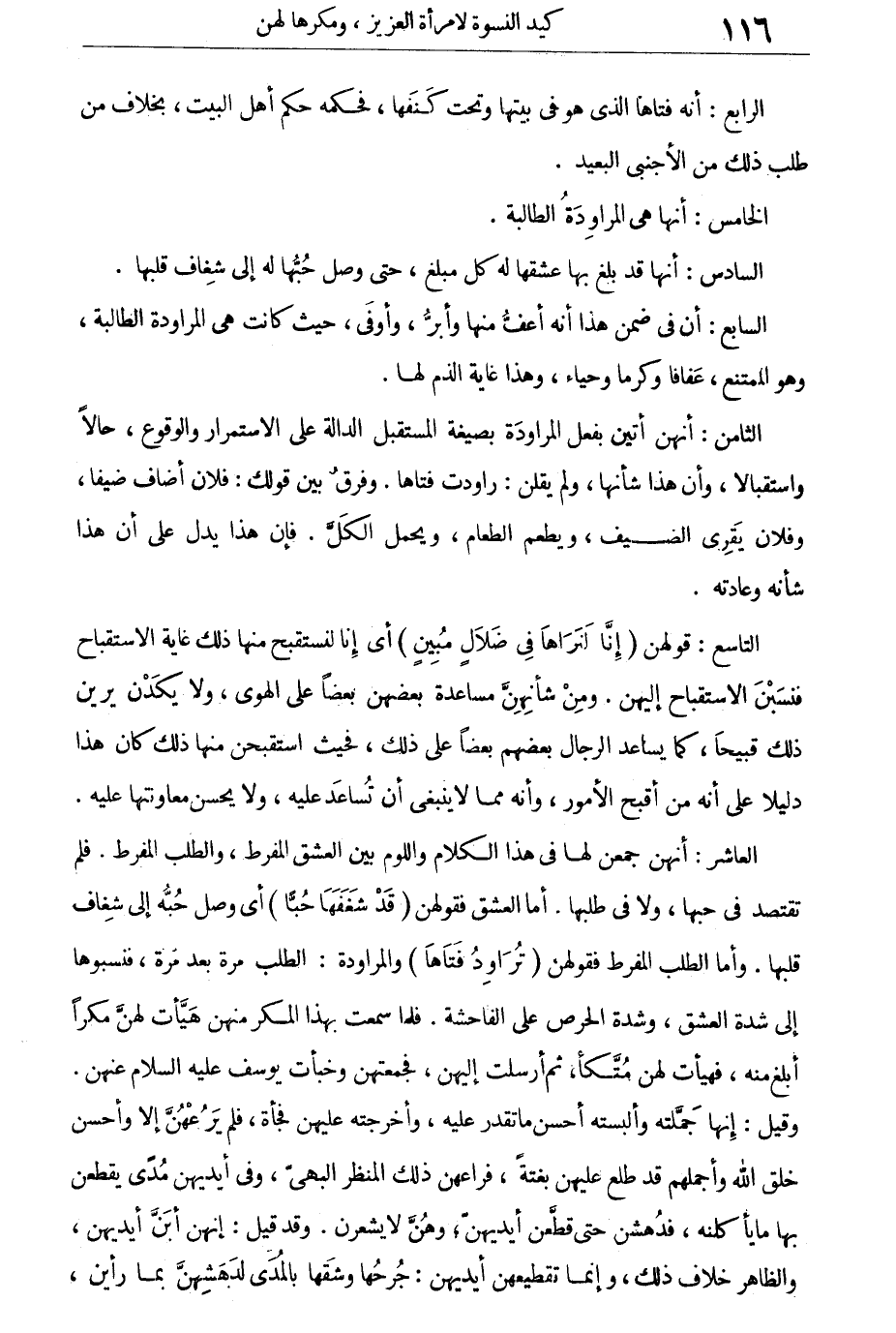 العاشر: أنهن جمعن لها فى هذا الكلام واللوم بين العشق المفرط، والطلب المفرط. فلم تقتصد فى حبها، ولا فى طلبها. أما العشق فقولهن: {قَدْ شَغَفَهَا حُباً} [يوسف: 30] .