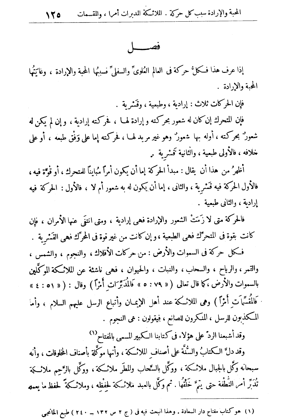 فالحركة متى لازمت الشعور والإرادة فهى إرادية، ومتى انتفى عنها الأمران، فإن كانت بقوة فى المتحرك فهى الطبعية، وإن كانت من غير قوة فى المحرك فهى القسرية.
