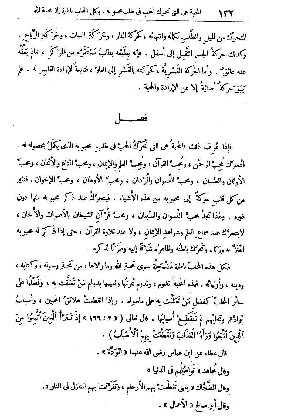 فكل هذه المحاب باطلة مضمحلة سوى محبة الله وما والاها، من محبة رسوله، وكتابه، ودينه، وأوليائه. فهذه المحبة تدوم وتدوم ثمرتها ونعيمها بدوام من تعلقت به، وفضلها على سائر المحاب كفضل من تعلقت به على ما سواه. وإذا انقطعت علائق المحبين، وأسباب توادهم وتحابهم لم تنقطع أسبابها. قال تعالى: {إذّ تَبَرَّأَ الّذِينَ اتُّبِعُوا مِنَ الّذِينَ اُتَّبَعُوا وَرَأَوُا الْعَذَابَ وَتقَطّعَتْ بِهِمُ الأَسْبَابُ} [البقرة: 166] .
