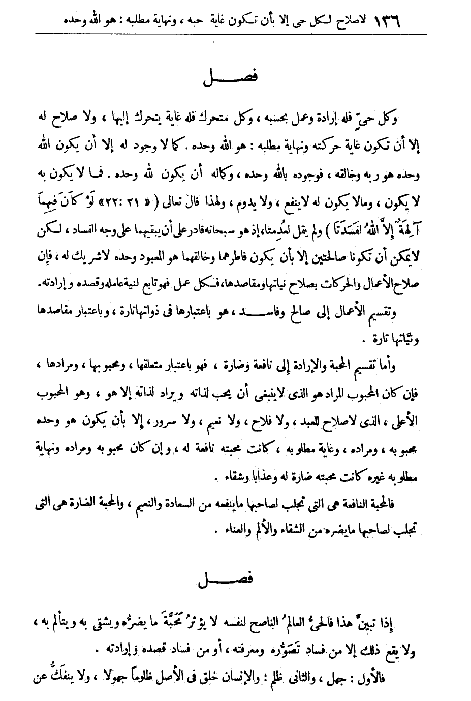 وكل حى فله إرادة وعمل بحسبه، وكل متحرك فله غاية يتحرك إليها، ولا صلاح له إلا أن تكون غاية حركته ونهاية مطلبه: هو الله وحده. كما لا وجود له إلا أن يكون الله وحده هو ربه وخالقه، فوجوده بالله وحده، وكماله أن يكون لله وحده. فما لا يكون به لا يكون، ومالا يكون له لا ينفع ولا يدوم، ولهذا قال تعالى: {لَوْ كانَ فِيهِمَا آلَهِةٌ إِلا اللهُ لَفَسَدَتَا} [الأنبياء: 22] .
