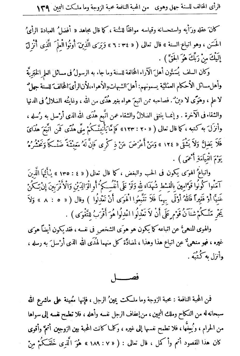 واتباع الهوى يكون فى الحب والبغض، كما قال تعالى: {يَا أَيُّهَا الّذِينَ آمَنُوا كُونُوا قَوَّامِينَ بِالْقِسْطِ شُهَدَاءَ للهِ وَلَوْ عَلَى أَنْفُسِكُمْ أَوِ الْوَالٍدَيْنِ وَالأقْرَبِينَ إنْ يَكُنْ غَنِيَّا أَوْ فَقِيراً فَاللهُ أَولَى بهِمَا فَلا تَتَّبِعُوا الْهَوى أَنْ تَعْدِلُوا} [النساء: 135] ، وقال: {وَلا يَجْرِمَنَّكُمْ شَنَآنُ قَوْمٍ عَلَى أَنْ لا تَعْدِلُوا اعْدِلُوا هُوَ أَقْرَبُ لِلتَّقْوَى} [المائدة: 8] .