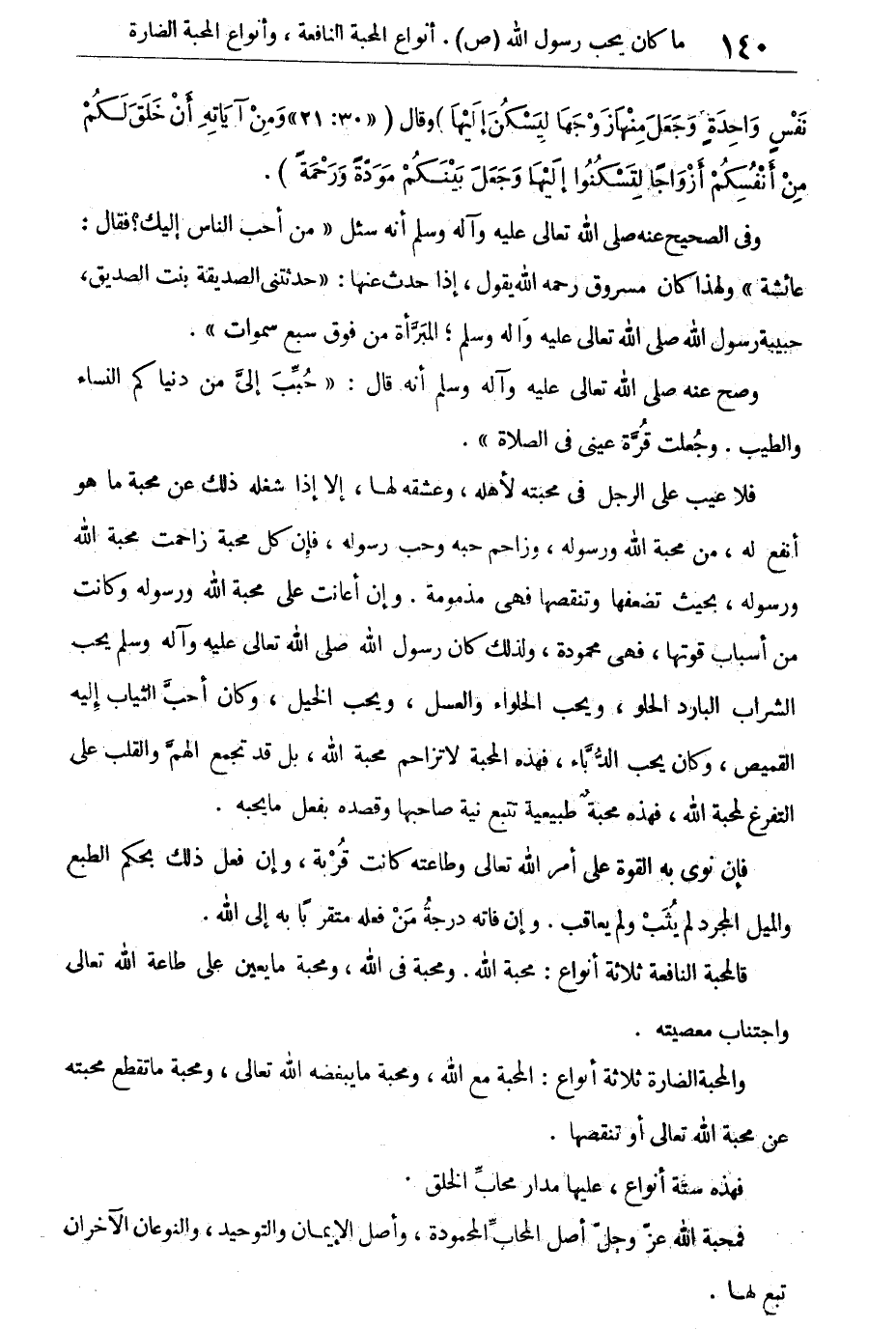 فلا عيب على الرجل فى محبته لأهله، وعشقه لها، إلا إذا شغله ذلك عن محبة ما هو أنفع له، من محبة الله ورسوله، وزاحم حبه وحب رسوله، فإن كل محبة زاحمت محبة الله ورسوله، بحيث تضعفها وتنقصها فهى مذمومة. وإن أعانت على محبة الله ورسوله وكانت من أسباب قوتها فهى محمودة، ولذلك كان رسول الله صلى الله تعالى عليه وآله وسلم يحب الشراب البارد الحلو، ويحب الحلواء والعسل، ويحب الخيل، وكان أحب الثياب إليه القميص، وكان يحب الدباء، فهذه المحبة لا تزاحم محبة الله، بل قد تجمع الهم والقلب على التفرغ لمحبة الله، فهذه محبة طبيعية تتبع نية صاحبها وقصده بفعل ما يحبه.