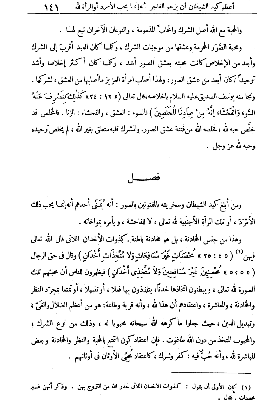 ومحبة الصور المحرمة وعشقها من موجبات الشرك، وكلما كان العبد أقرب إلى الشرك وأبعد من الإخلاص كانت محبته بعشق الصور أشد، وكلما كان أكثر إخلاصا وأشد توحيدا، كان أبعد من عشق الصور، ولهذا أصاب امرأة العزيز ما أصابها من العشق، لشركها. ونجا منه يوسف الصديق عليه السلام بإخلاصه، قال تعالى: {كَذلِكَ لِنَصْرِفَ عَنْهُ السُّوءَ وَالْفَحْشَاءَ إِنَّهُ مِنْ عِبَادِنَا المُخْلَصِينَ} [يوسف: 24] .