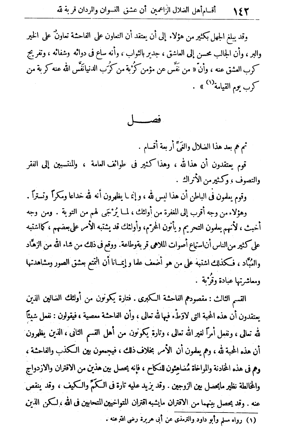 القسم الثالث: مقصودهم الفاحشة الكبرى. فتارة يكونون من أولئك الضالين الذين يعتقدون أن هذه المحبة التى لا وطء فيها لله تعالى، وأن الفاحشة معصية، فيقولون نفعل شيئا لله تعالى، ونفعل أمرا لغير الله تعالى، وتارة يكونون من أهل القسم الثانى الذين يظهرون أن هذه المحبة لله، وهم يعلمون أن الأمر بخلاف ذلك، فيجمعون بين الكذب والفاحشة، وهم فى هذه المخادنة والمواخاة مضاهئون للنكاح، فإنه يحصل بين هذين من الاقتران والازدواج والمخالطة نظير ما يحصل بين الزوجين. وقد يزيد عليه تارة فى الكم والكيف، وقد ينقص عنه. وقد يحصل بينهما من الاقتران ما يشبه اقتران المتواخيين المتحابين فى الله، لكن الذين