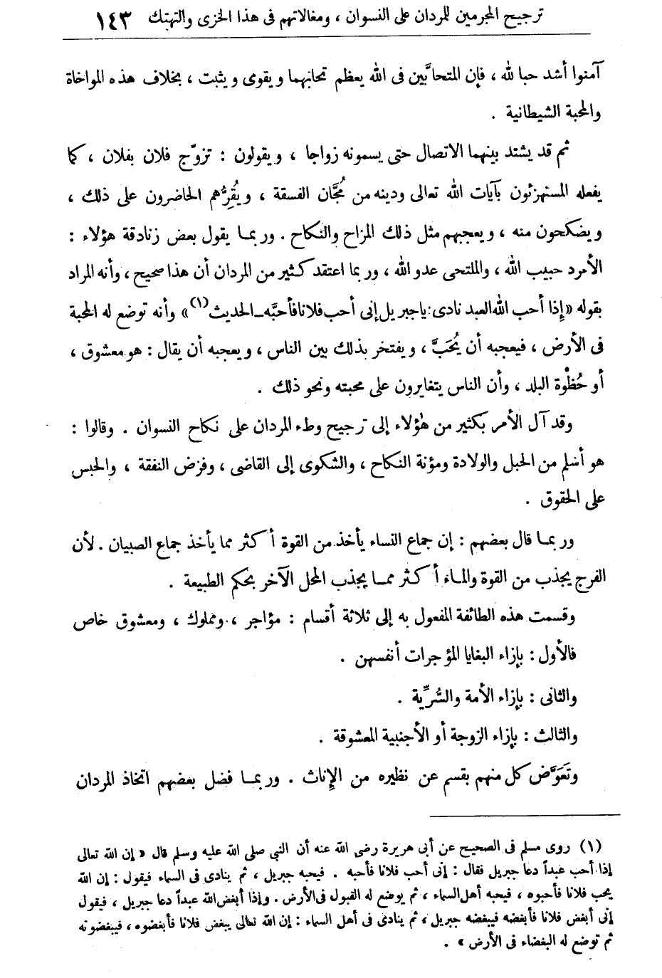 وقد آل الأمر بكثير من هؤلاء إلى ترجيح وطء المردان على نكاح النسوان. وقالوا: هو أسلم من الحبل والولادة ومؤنة النكاح، والشكوى إلى القاضى، وفرض النفقة، والحبس على الحقوق.