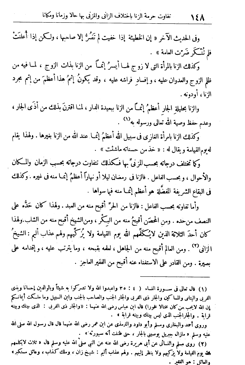 وكما تختلف درجاته بحسب المزنى بها فكذلك تتفاوت درجاته بحسب الزمان والمكان والأحوال، وبحسب الفاعل. فالزنا فى رمضان ليلا أو نهاراً أعظم إثما منه فى غيره. وكذلك فى البقاع الشريفة المفضلة هو أعظم إثما منه فيما سواها.