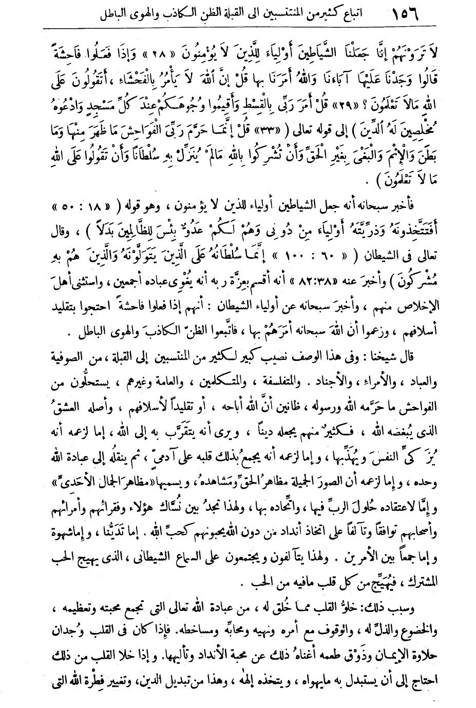 قال شيخنا: وفى هذا الوصف نصيب كبير لكثير من المنتسبين إلى القبلة، من الصوفية والعُبّاد، والأمراء، والأجناد، والمتفلسفة، والمتكلمين، والعامة وغيرهم، يستحلون من الفواحش ما حرمه الله ورسوله، ظانين أن الله أباحه، أو تقليدا لأسلافهم وأصله العشق الذى يبغضه الله، فكثير منهم يجعله ديناً، ويرى أنه يتقرب به إلى الله، إما لزعمه أنه يزكى النفس ويهذبها، وإما لزعمه أنه يجمع بذلك قلبه على آدمى، ثم ينقله إلى عبادة الله وحده، وإما لزعمه أن الصور الجميلة مظاهر الحق ومشاهده، ويسميها "مظاهر الجمال الأحدى" وإما لاعتقاده حلول الرب فيها، واتحاده بها، ولهذا تجد بين نساك هؤلاء وفقرائهم وأمرائهم وأصحابهم توافقا وتآلفا على اتخاذ أنداد من دون الله يحبونهم كحب الله. إما تَدَيُّناً، وإما شهوة، وإما جمعاً بين الأمرين. ولهذا يتآلفون ويجتمون على السماع الشيطانى، الذى يهيج الحب المشترك، فُيَهيِّج من كل قلب ما فيه من الحب.