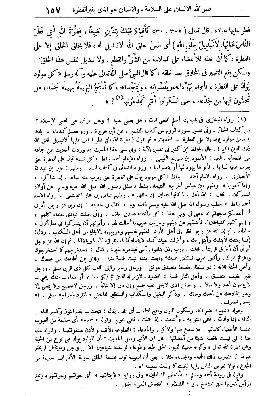 أى نُفس خلق الله لا تبديل له، فلا يخلق الخلق إلا على الفطرة، كما أن خلقه للأعضاء على السلامة من الشق والقطع. ولا تبديل لنفس هذا الخلق. ولكن يقع التغيير فى المخلوق بعد خلقه، كما قال النبى صلى الله تعالى عليه وآله وسلم: " كُلُّ مَوْلُودٍ يُولَدُ عَلَى الْفِطْرَةِ، فَأَبَوَاهُ يَهُوِّدَانِهِ، وَيُنَصِّرَانِهِ، وَيمَجِّسَانِهِ، كَمَا تَنْتَجُ الْبَهميَةُ بَهِيمَةً جَمْعَاءَ، هَلْ تَحِسُّونَ فِيهَا مِنْ جَدْعَاءَ، حَتَّى تَكُونُوا أَنْتُمْ تَجْدَعُونهَا".