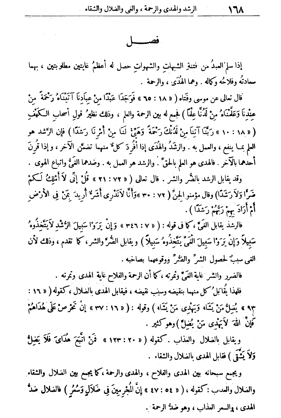 وجمع سبحانه بين الهدى والفلاح، والهدى والرحمة، كما يجمع بين الضلال والشقاء والضلال والعذاب: كقوله: {إنَّ المُجْرِمِينَ فِى ضَلاَلٍ وَسُعُرٍ} [القمر: 47] .