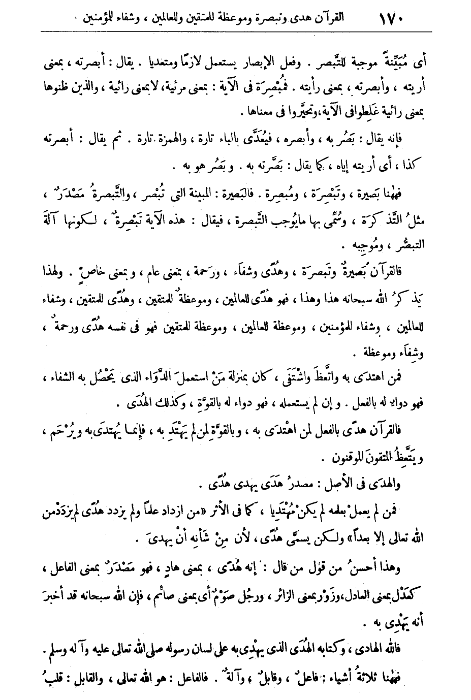 فالقرآن بصيرة وتبصرة، وهدى وشفاء، ورحمة، بمعنى عام، وبمعنى خاص. ولهذا يذكر الله سبحانه هذا وهذا، فهو هدى للعالمين، وموعظة للمتقين، وهدى للمتقين، وشفاء للعالمين، وشفاء للمؤمنين، وموعظة للعالمين، وموعظة للمتقين، فهو فى نفسه هدى ورحمة، وشفاء وموعظة.