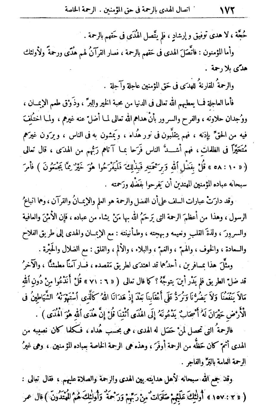 فالرحمة التى تحصل لمن حصل له الهدى، هى بحسب هداه، فكلما كان نصيبه من الهدى أتم كان حظه من الرحمة أوفر، وهذه هى الرحمة الخاصة بعباده المؤمنين، وهى غير الرحمة العامة بالبر والفاجر.