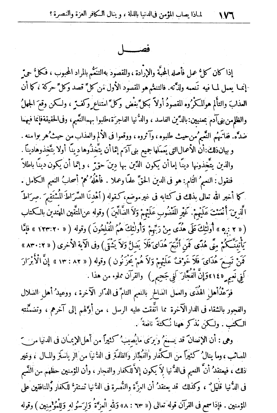 ولكن نذكر هاهنا نكتة نافعة. وهى: أن الإنسان قد يسمع ويرى ما يصيب كثيرا من أهل الإيمان فى الدنيا من المصائب، وما ينال كثيرا من الكفار والفجار والظلمة فى الدنيا من الرياسة والمال، وغير ذلك، فيعتقد أن النعيم فى الدنيا لا يكون إلا للكفار والفجار، وأن المؤمنين حظهم من النعيم فى الدنيا قليل، وكذلك قد يعتقد أن العزة والنصرة فى الدنيا قد تستقر للكفار والمنافقين على المؤمنين. فإذا سمع فى القرآن قوله تعالى: