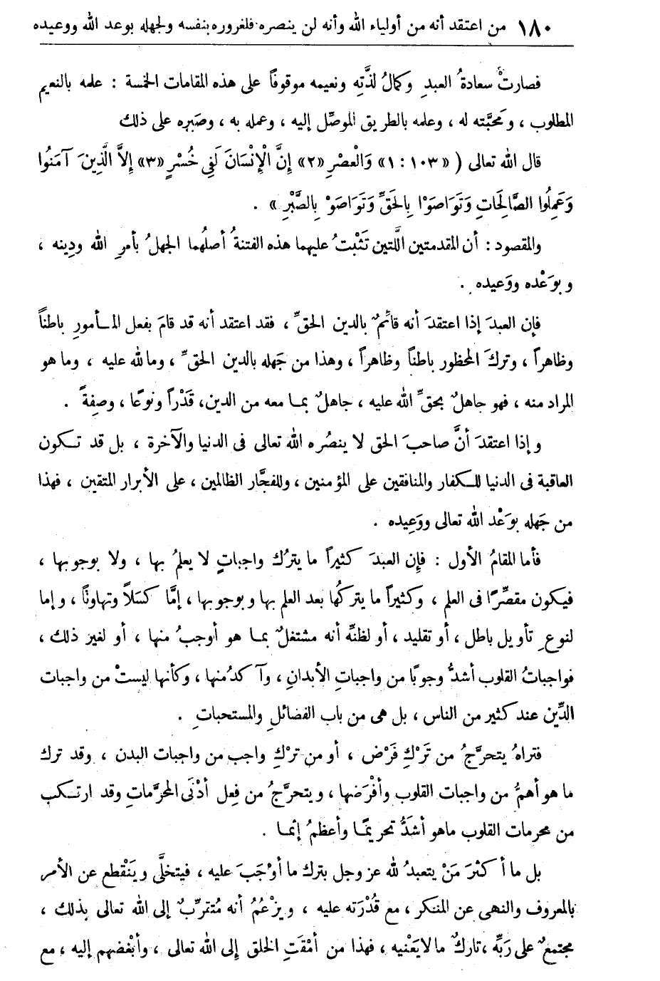 فأما المقام الأول: فإن العبد كثيرا ما يترك واجبات لا يعلم بها، ولا بوجوبها، فيكون مقصرا فى العلم، وكثيرا ما يتركها بعد العلم بها وبوجوبها، إما كسلا وتهاونا، وإما لنوع تأويل باطل، أو تقليد، أو لظنه أنه مشتغل بما هو أوجب منها، أو لغير ذلك، فواجبات القلوب أشد وجوبا من واجبات الأبدان، وآكد منها، وكأنها ليست من واجبات الدين عند كثير من الناس، بل هى من باب الفضائل والمستحبات.
