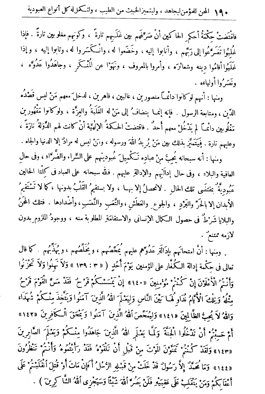 فاقتضت حكمة أحكم الحاكمين أن صرفهم بين غَلَبهم تارة، وكونهم مغلوبين تارة، فإذا غُلِبوا تضرعوا إلى ربهم، وأنابوا إليه، وخضعوا له، وانكسروا له وتابوا إليه، وإذا غلبوا أقاموا دينه وشعائره، وأمروا بالمعروف، ونهوا عن المنكر، وجاهدوا عدوه، ونصروا أو لياءه.