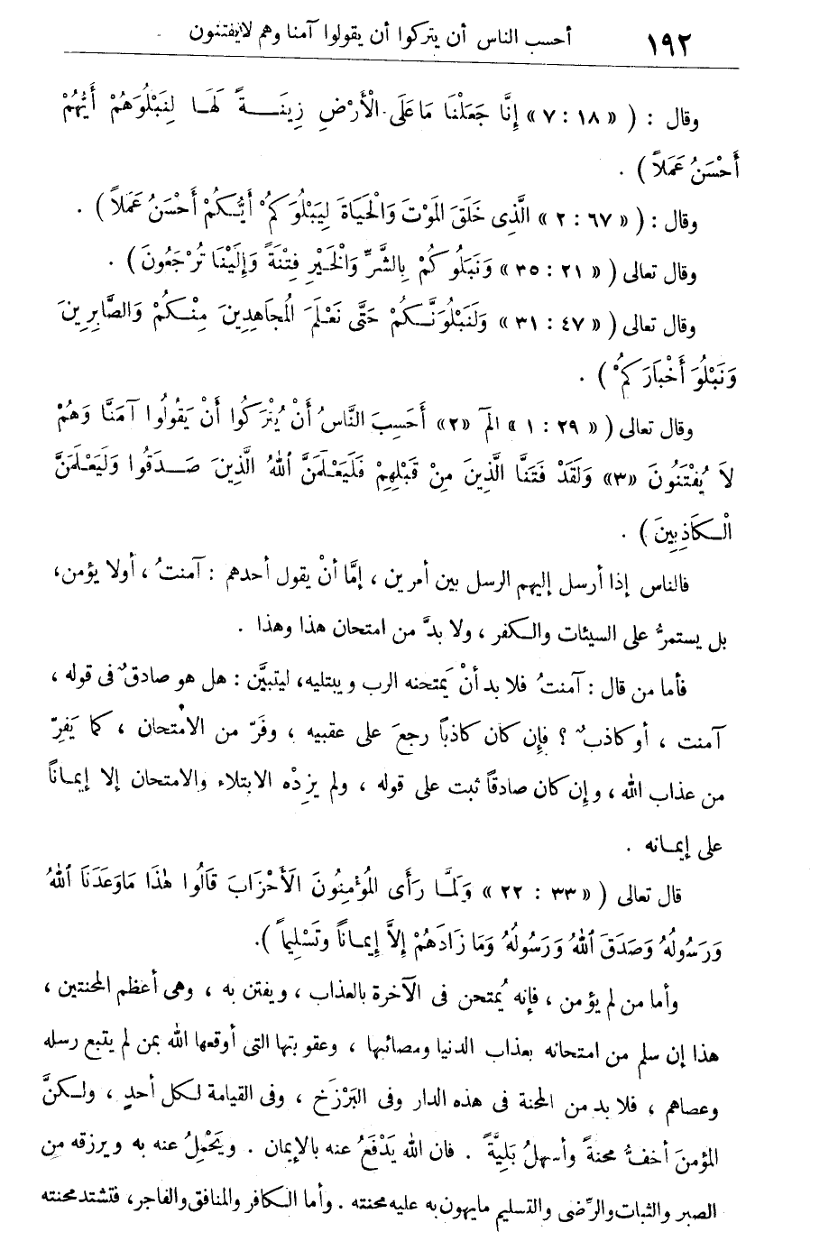 فأما من قال: آمنت فلا بد أن يمتحنه الرب ويبتليه، ليتبين: هل هو صادق فى قوله، آمنت، أو كاذب؟ فإن كان كاذبا رجع على عقبيه، وفر من الامتحان، كما يفر من عذاب الله، وإن كان صادقا ثبت على قوله، ولم يزده الابتلاء والامتحان إلا إيمانا على إيمانه.