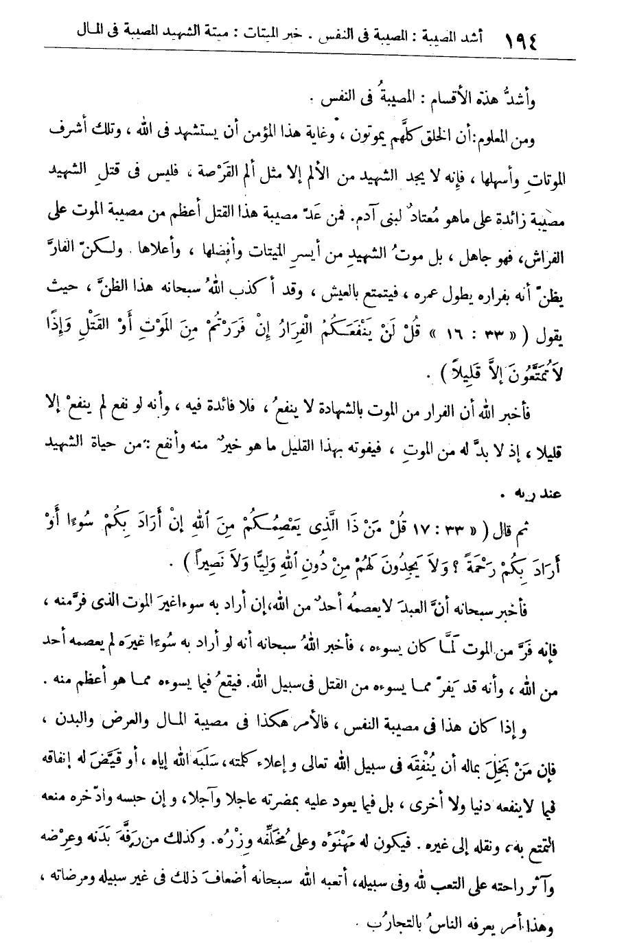 ومن المعلوم أن الخلق كلهم يموتون، وغاية هذا المؤمن أن يستشهد فى الله، وتلك أشرف الموتات وأسهلها، فإنه لا يجد الشهيد من الألم إلا مثل ألم القرصة، فليس فى قتل الشهيد مصيبة زائدة على ما هو معتاد لبنى آدم. فمن عد مصيبة هذا القتل أعظم من مصيبة الموت على الفراش فهو جاهل، بل موت الشهيد من أيسر الميتات وأفضلها وأعلاها ولكن الفارَّ يظن أنه بفراره يطول عمره، فيتمتع بالعيش، وقد أكذب الله سبحانه هذا الظن، حيث يقول: