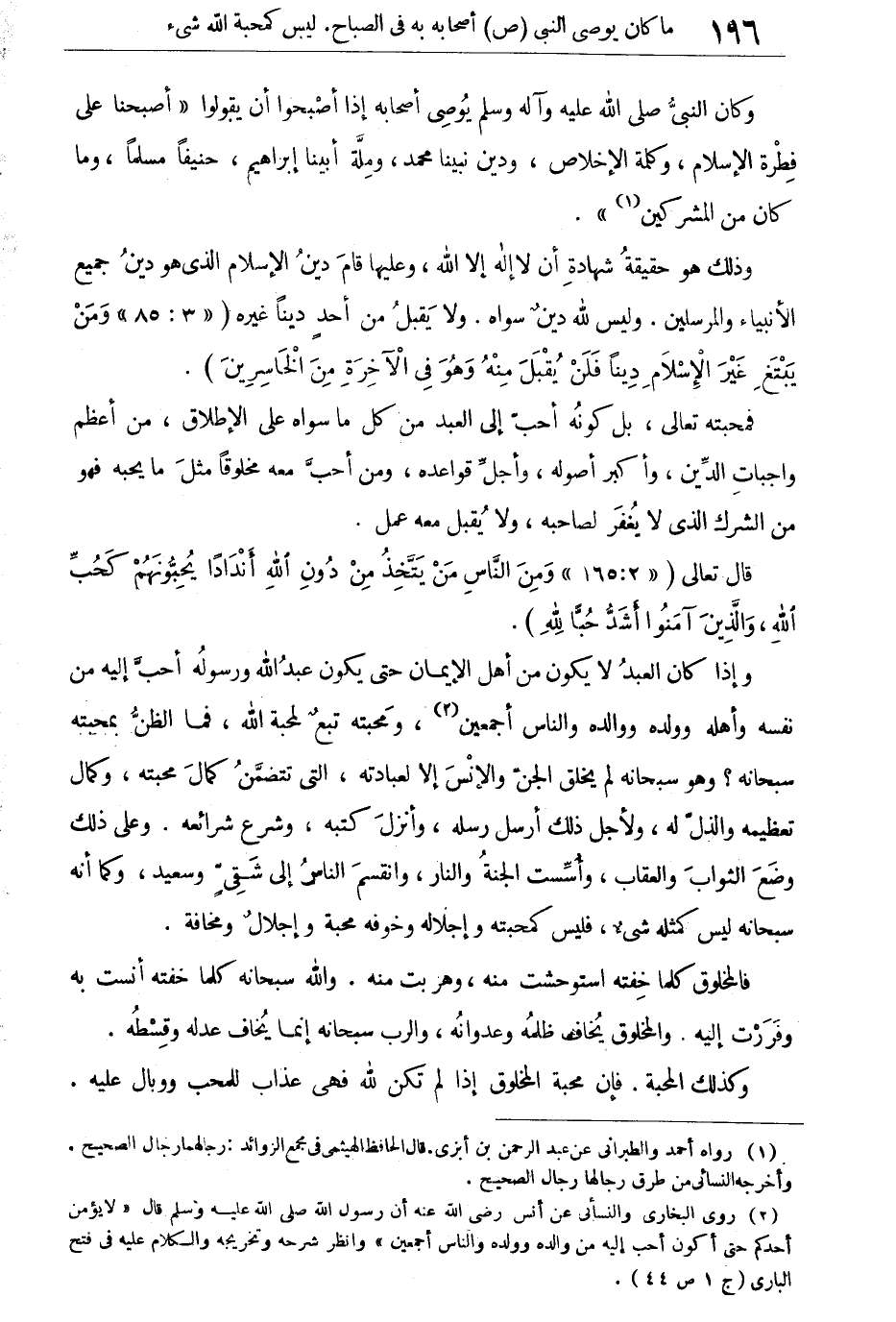 وإذا كان العبد لا يكون من أهل الإيمان حتى يكون عبد الله ورسوله أحب إليه من نفسه وأهله وولده ووالده والناس أجمعين، ومحبته تبع لمحبة الله، فما الظن بمحبته سبحانه؟ وهو سبحانه لم يخلق الجن والإنس إلا لعبادته، التى تتضمن كمال تعظيمه والذل له، ولأجل ذلك أرسل رسله، وأنزل كتبه، وشرع شرائعه. وعلى ذلك وضع الثواب والعقاب، وأسست الجنة والنار، وانقسم الناس إلى شقى وسعيد، وكما أنه سبحانه ليس كمثله شيء، فليس كمحبته وإجلاله محبة وإجلال ومخافة.