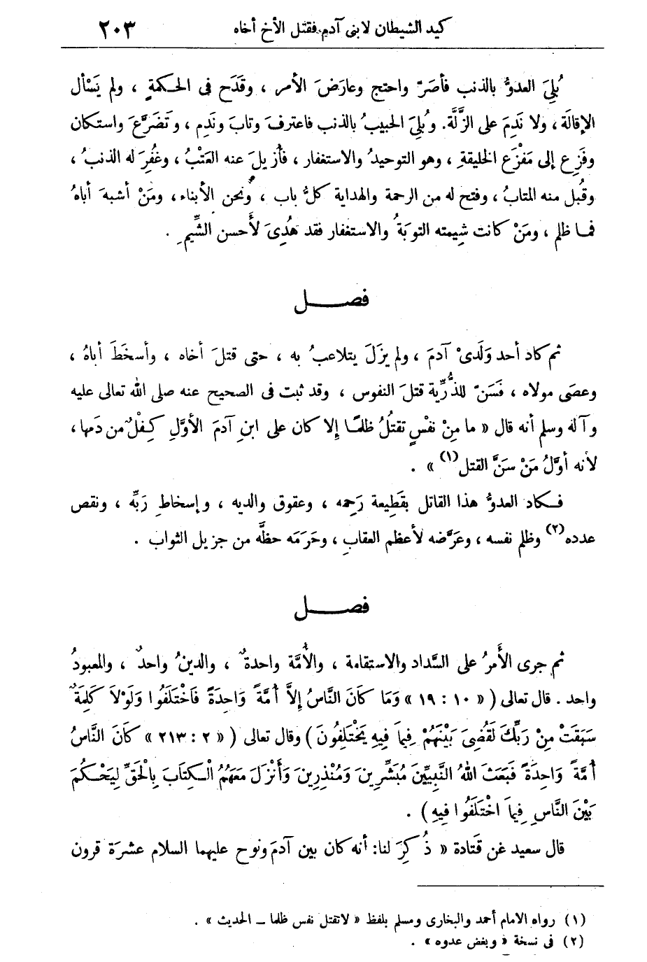 ثم كاد أحد ولدى آدم، ولم يزل يتلاعب به، حتى قتل أخاه، وأسخط أباه، وعصى مولاه، فسن للذرية قتل النفوس، وقد ثبت فى الصحيح عنه صلى الله تعالى عليه وآله وسلم أنه قال: