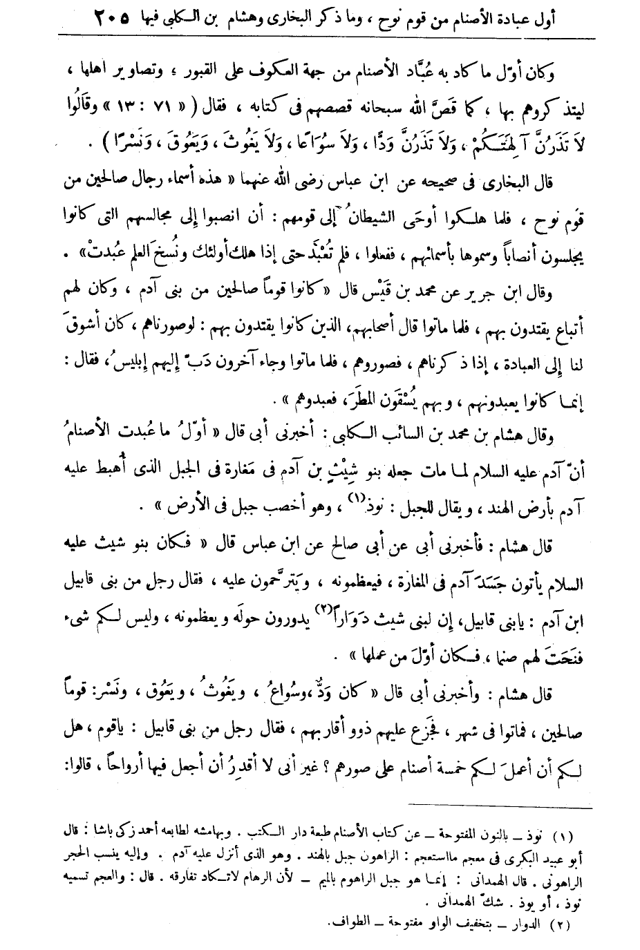 قال البخارى فى صحيحه عن ابن عباس رضى الله عنهما "هذه أسماء رجال صالحين من قوم نوح، فلما هلكوا أوحى الشيطان إلى قومهم: أن انصبوا إلى مجالسهم التى كانوا يجلسون أنصابا وسموها بأسمائهم، ففعلوا، فلم تعبد حتى إذا هلك أولئك ونسخ العلم عبدت".