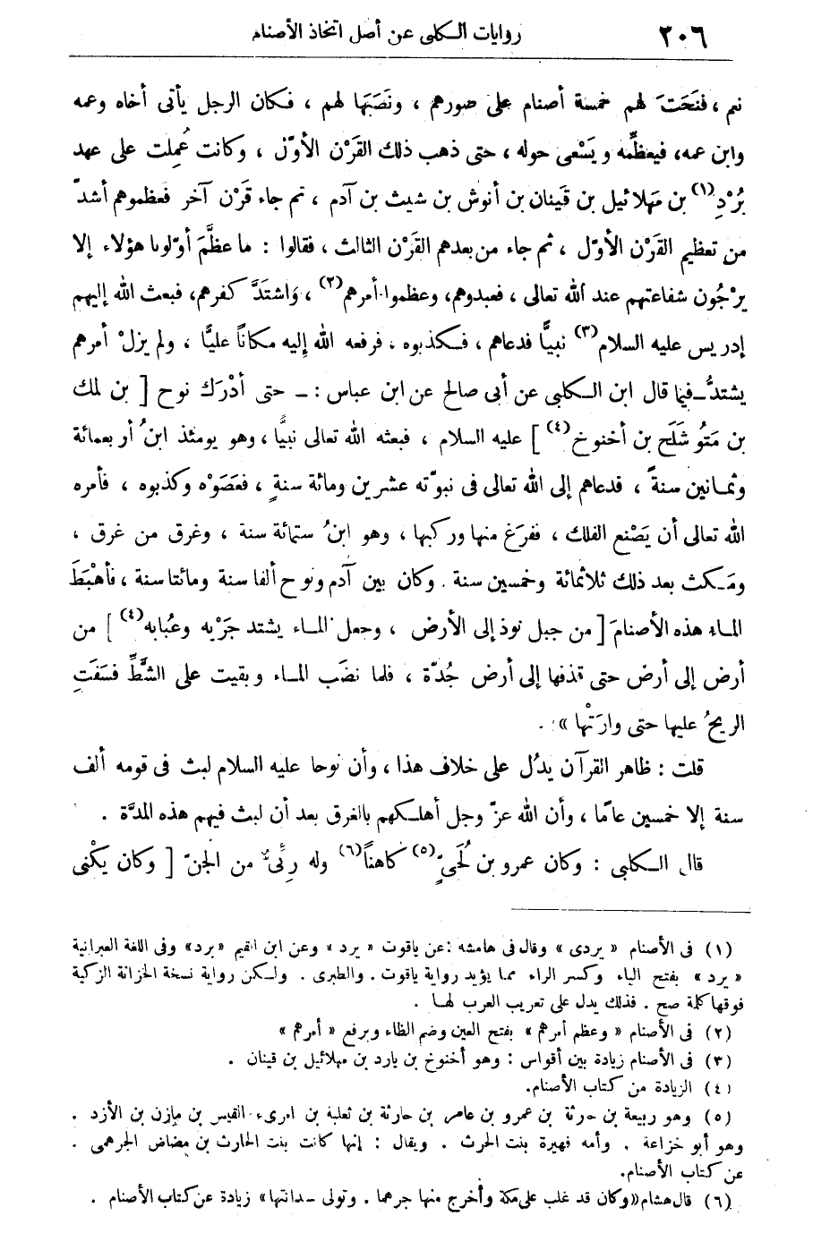نعم، فنحت لهم خمسة أصنام على صورهم، ونصبها لهم، فكان الرجل يأتى أخاه وعمه وابن عمه، فيعظمه ويسعى حوله، حتى ذهب ذلك القرن الأول وكانت عملت على عهد برد ابن مهلائيل بن قينان بن أنوش بن شيث بن آدم، ثم جاء قرن آخر فعظموهم أشد من تعظيم القرن الأول، ثم جاء من بعدهم القرن الثالث، فقالوا: ما عظم أولونا هؤلاء إلا يرجون شفاعتهم عند الله تعالى، فعبدوهم، وعظموا أمرهم، واشتد كفرهم، فبعث الله إليهم إدريس عليه السلام نبيا فدعاهم، فكذبوه، فرفعه الله مكانا عليا، ولم يزل أمرهم يشتد فيما قال ابن الكلبى عن أبى الكلبى عن أبى صالح عن ابن عباس: - حتى أدرك نوح عليه السلام، فبعثه الله تعالى نبيا، وهو يومئذ ابن أربعمائة وثمانين سنة، فدعاهم إلى الله تعالى فى نبوته عشرين ومائة سنة، فعصوه وكذبوه، فأمره الله تعالى أن يصنع الفلك، ففرغ منها وركبها، وهو ابن ستمائة سنة، وغرق من غرق، ومكث بعد ذلك ثلاثمائة وخمسين سنة فدعاهم إلى الله. وكان بين آدم ونوح ألفا سنة ومائتا سنة: فأهبط الماء هذه الأصنام من أرض إلى أرض حتى قذفها إلى أرض جدة، فلما نضب الماء وبقيت على الشط فسفت الريح عليها حتى وارتها".