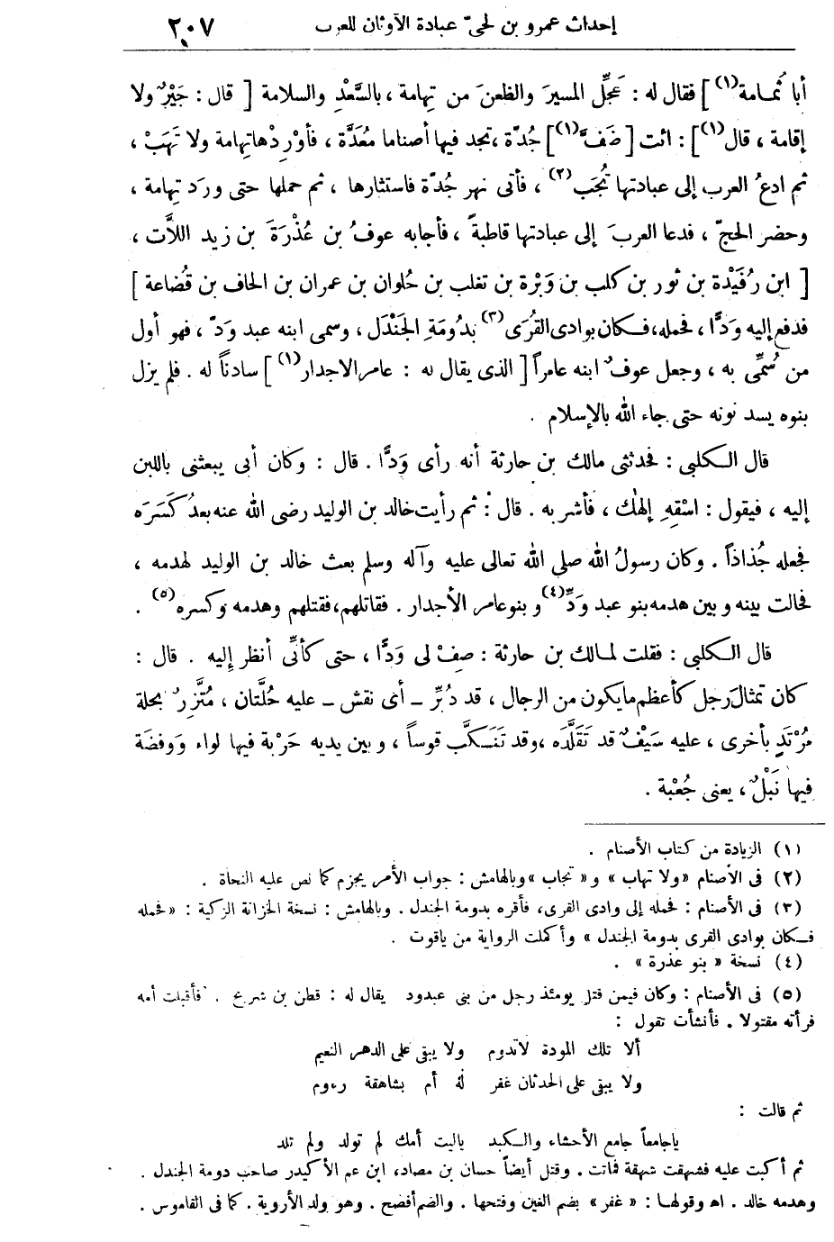 عجل المسير والظعن من تهامة، بالسعد والسلامة قال: جير ولا إقامة، قال: ائت ضف جدة، تجد فيها أصناما معدة، فأوردها تهامة ولا تهب، ثم ادع العرب إلى عبادتها تجب. فأتى نهر جدة فاستثارها، ثم حملها حتى ورد تهامة، وحضر الحج، فدعا العرب إلى عبادتها قاطبة، فأجابه عوف بن عذرة بن زيد اللات، ابن رفيدة بن ثور بن كلب بن وبرة بن تغلب ابن حلوان بن عمران بن الحاف بن قضاعة فدفع إليه ودا، فحمله فكان بوادى القرى بدومة الجندل، وسمى ابنه عبدود، فهو أول من سمى به، وجعل عرف ابنه عامرا الذى يقال له: عامر الأجدار سادنا له. فلم يزل بنوه يسد نونه حتى جاء الله بالإسلام.