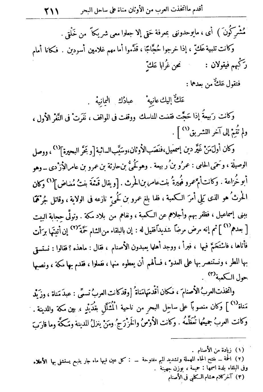 واتخذت العرب الأصنام، فكان أقدمها مناة وقد كانت العرب تسمى: عبد مناة وزيد مناة وكان منصوبا على ساحل البحر من ناحية المشلل بقديد، بين مكة والمدينة وكانت العرب جميعها تعظمه. وكانت الأوس والخرزج ومن ينزل المدينة ومكة وما قارب