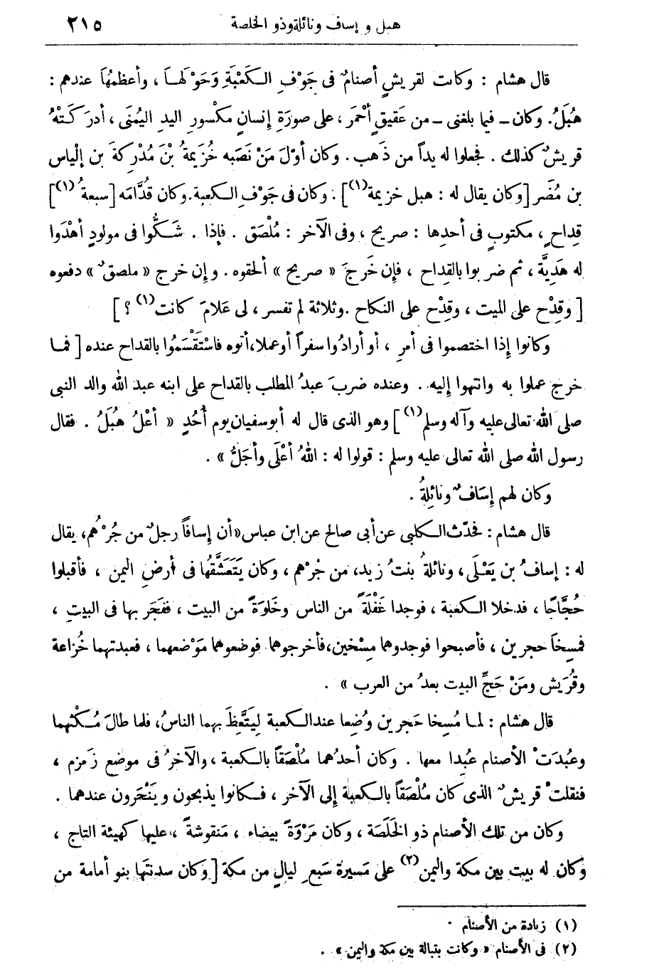 قال هشام: لما مسخا حجرين وضعا عند الكعبة ليتعظ بهما الناس، فلما طال مكثهما وعبدت الأصنام عبدا معها. وكان أحدهما ملصقا بالكعبة والآخر فى موضع زمزم، فنقلت قريش الذى كان ملصقا بالكعبة إلى الآخر، فكانوا يذبحون عندهما.