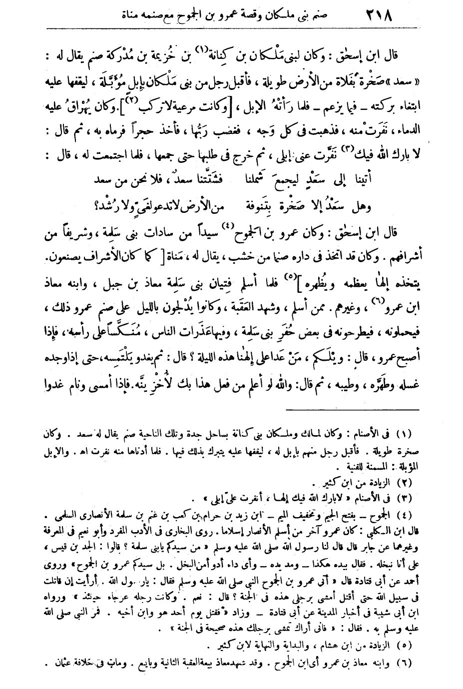 قال ابن إسحق: وكان عمرو بن الجموح سيدا من سادات بنى سلمة، وشريفا من أشرافهم. وكان قد اتخذ فى داره صنما من خشب، يقال له مناة [كما كان الأشراف يصنعون. يتخذه إلها يعظمه ويظهره] فلما أسلم فتيان بنى سلمة معاذ بن جبل، وابنه معاذ بن عمرو، وغيرهم ممن أسلم، وشهد العقبة، وكانوا يدلجون بالليل على صنم عمرو ذلك، فيحملونه، فيطرحونه فى بعض حفر بنى سلمة، وفيها عذرات الناس منكسا على رأسه، فإذا أصبح عمرو، قال: ويلكم، من عدا على إلهنا هذه الليلة؟ قال ثم يغدو يلتمسه، حتى إذا وجده غسله وطهره، وطيبه، ثم قال: والله لو أعلم من فعل هذا بك لأخزينه. فإذا أمسى ونام غدوا