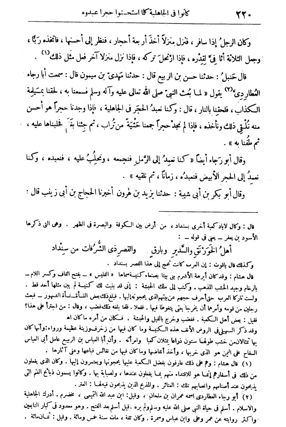 قال حنبل: حدثنا حسن بن الربيع قال: حدثنا مهدى بن ميمون قال: سمعت أبا رجاء العُطارِدى يقول "لما بُعث النبى صلى الله تعالى عليه وآله وسلم فسمعنا به، لحقنا بمسيلمة الكذاب، فلحقنا بالنار، قال: وكنا نعبد الحجر فى الجاهلية، فإذا وجدنا حجرا هو أحسن منه نلقى ذلك ونأخذه، فإذا لم نجد حجرا جمعنا حثية من تراب ثم جئنا بغنم فحلبناها عليه، ثم طفنا به".