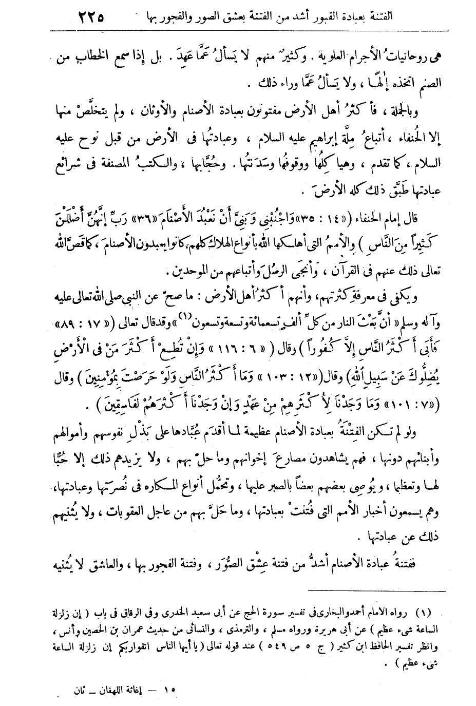 ولو لم تكن الفتنة بعبادة الأصنام عظيمة لما أقدم عبادها على بذل نفوسهم وأموالهم وأبنائهم دونها، فهم يشاهدون مصارع إخوانهم وما حل بهم، ولا يزيدهم ذلك إلا حبا لها وتعظيما، ويوصى بعضهم بعضا بالصبر عليها، وتحمل أنواع المكاره فى نصرتها وعبادتها، وهم يسمعون أخبار الأمم التى فتنت بعبادتها، وما حل بهم من عاجل العقوبات، ولا يثنيهم ذلك عن عبادتها.