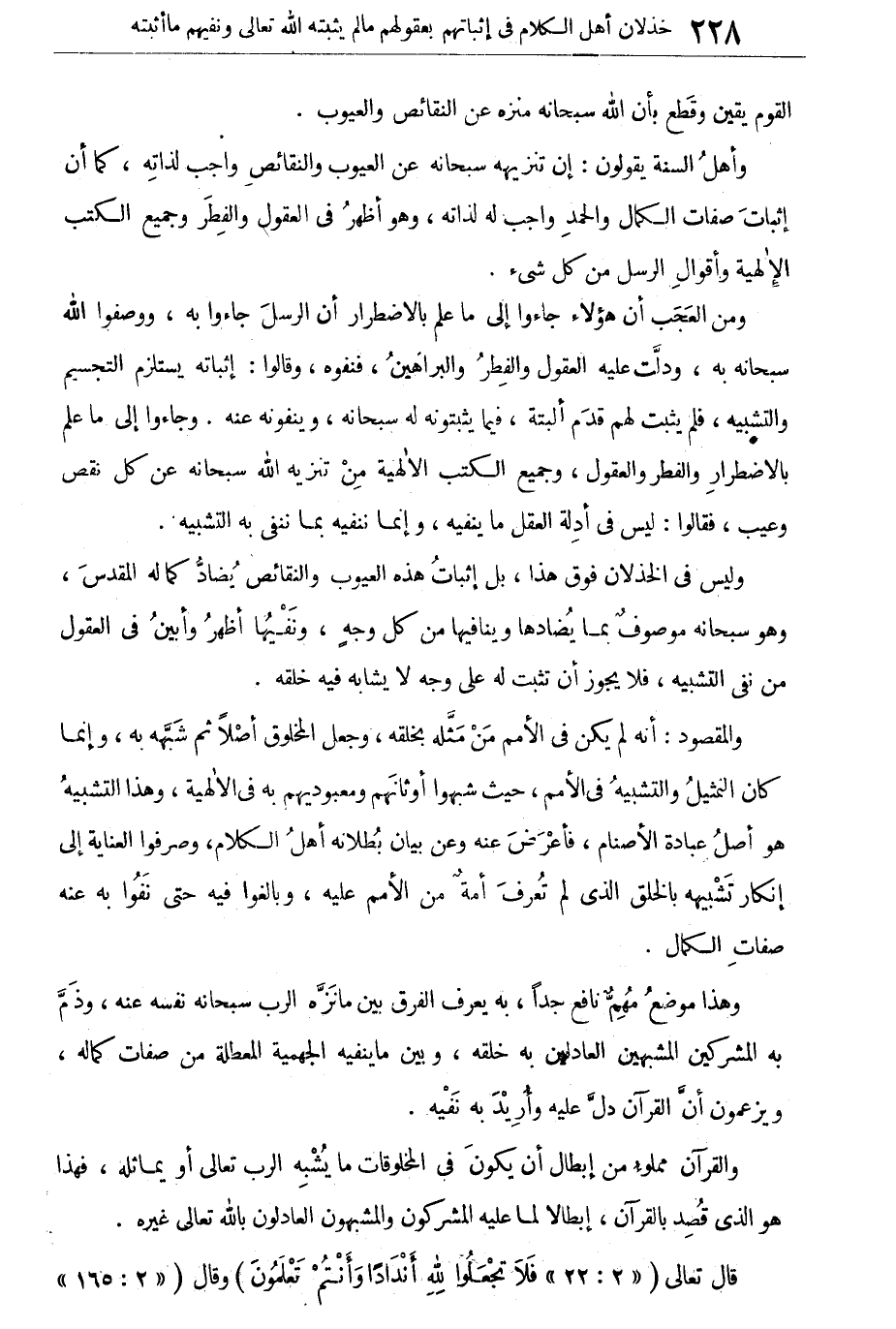وليس فى الخذلان فوق هذا، بل إثبات هذه العيوب والنقائص يضاد كماله المقدس وهو سبحانه موصوف بما يضادها وينافيها من كل وجه، ونفيها أظهر وأبين فى العقول من نفى التشبيه، فلا يجوز أن يثبت له على وجه لا يشابه فيه خلقه.