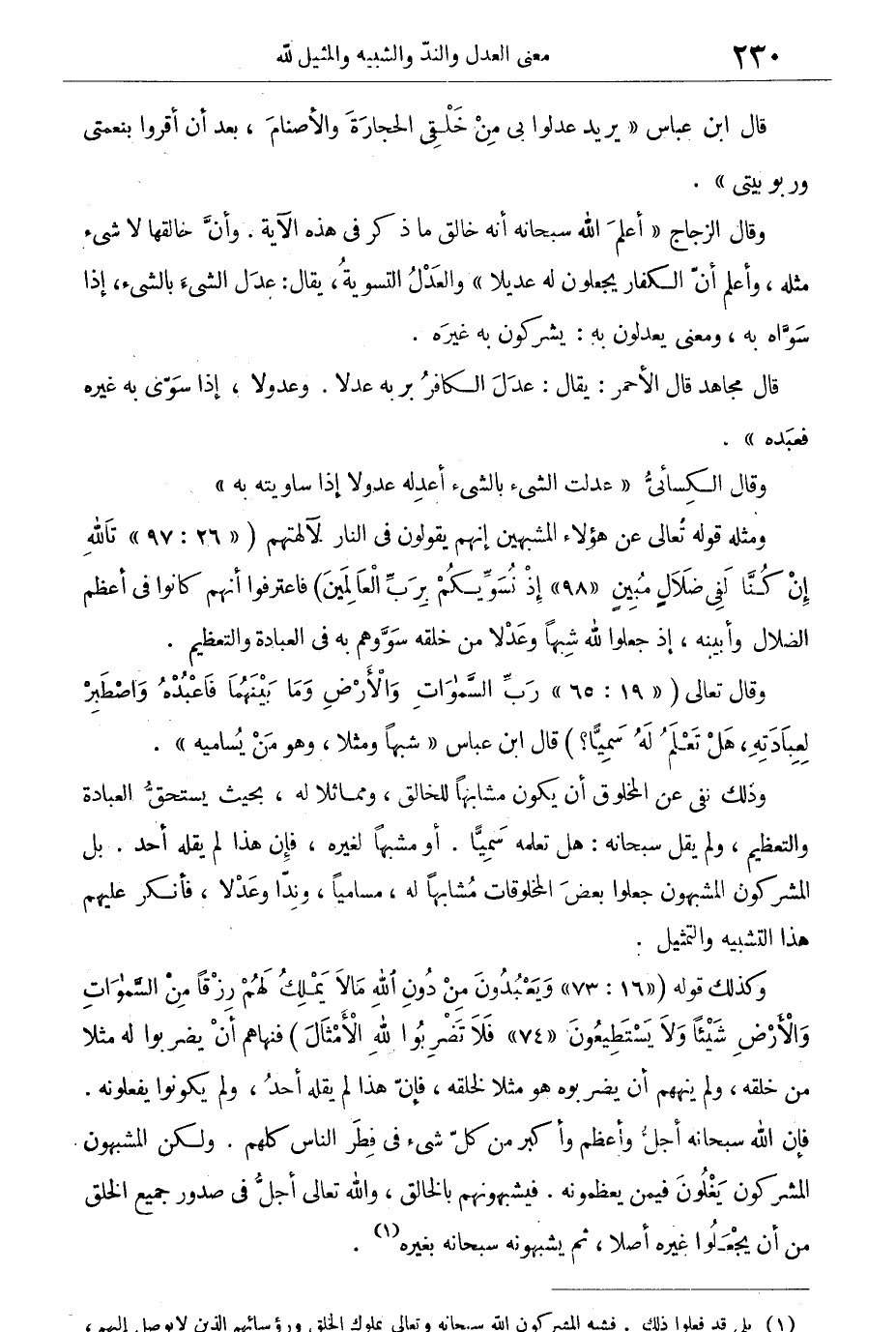 ومثله قوله تعالى عن هؤلاء المشبهين إنهم يقولون فى النار لآلهتهم: {تَاللهِ إِنْ كُنَّا لَفِى ضَلاَلٍ مُبِينٍ إِذْ نُسَوِّيكُمْ بِرَبِّ الْعَالَمِينَ} [الشعراء: 97- 98] .