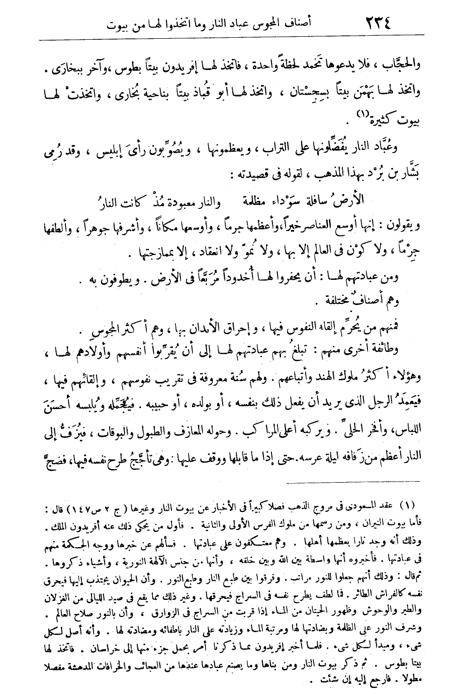 وعباد النار يفضلونها على التراب، ويعظمونها، ويصوبون رأى إبليس، وقد رمى بشار بن برد بهذا المذهب، لقوله فى قصيدته: