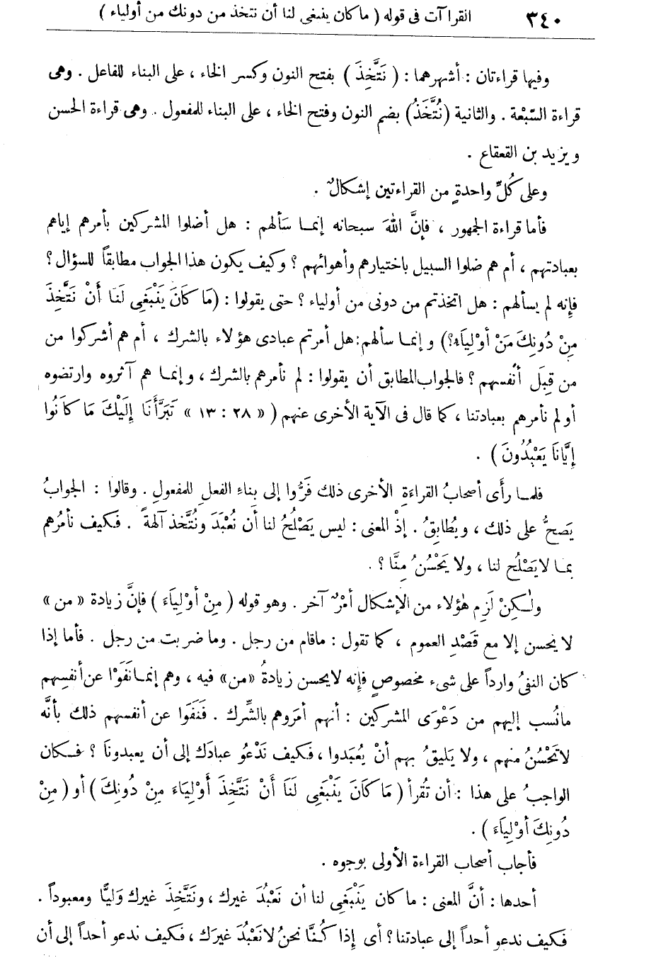 فإن زيادة ((من)) لا يحسن إلا مع قصد العموم، كما تقول: ما قام من رجل. وما ضربت من رجل. فأما إذا كان النفى واردا على شيء مخصوص فإنه لا يحسن زيادة ((من فيه، وهم إنما نفوا عن أنفسهم ما نسب إليهم من دعوى المشركين: أنهم أمروهم بالشرك. فنفوا عن أنفسهم ذلك بأنه لا تحسن منهم، ولا يليق بهم أن يعبدوا، فكيف ندعو عبادك إلى أن يعبدونا؟ فكان الواجب على هذا: أن تقرأ: {مَا كانَ يَنْبَغِى لَنَا أَنْ نَتَّخِذَ أَوْلِيَاءَ مِنْ دُونِكَ أو مِنْ دُونِكَ أَوْلِيَاءَ} .