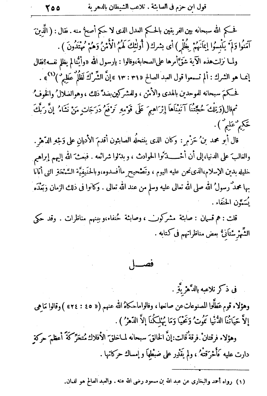 قال أبو محمد بن حَزْم: وكان الذى ينتحله الصابئون أقدم الأديان على وجْه الدهر والغالب على الدنيا، إلى أن أحدثوا الحوادث، وبدلوا شرائعه. فبعث الله إليهم إبراهيم خليله بدين الإسلام، الذى نحن عليه اليوم، وتصحيح ما أفسدوه، وبالحنيفية السمحة التى أتانا بها محمد رسول الله صلى الله تعالى عليه وسلم من عند الله تعالى. وكانوا فى ذلك الزمان وبعده يسمون الحنفاء.