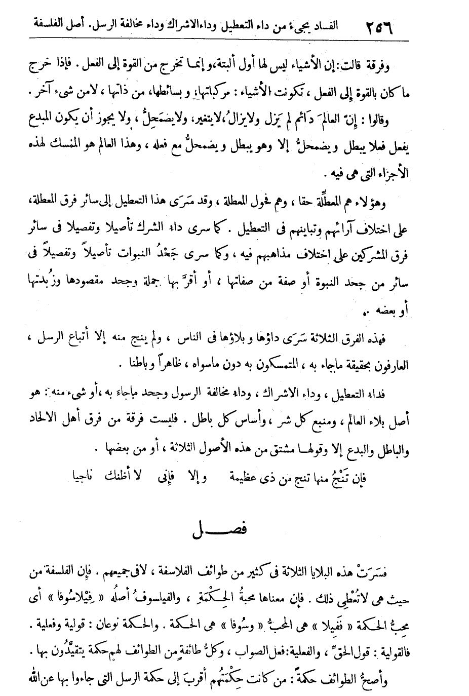 فداء التعطيل، وداء الإشراك، وداء مخالفة الرسول وجحد ما جاء به، أو شيء منه: هو أصل بلاء العالم، ومنبع كل شر، وأساس كل باطل. فليست فرقة من فرق أهل الإلحاد والباطل والبدع إلا وقولها مشتق من هذه الأصول الثلاثة، أو من بعضها.