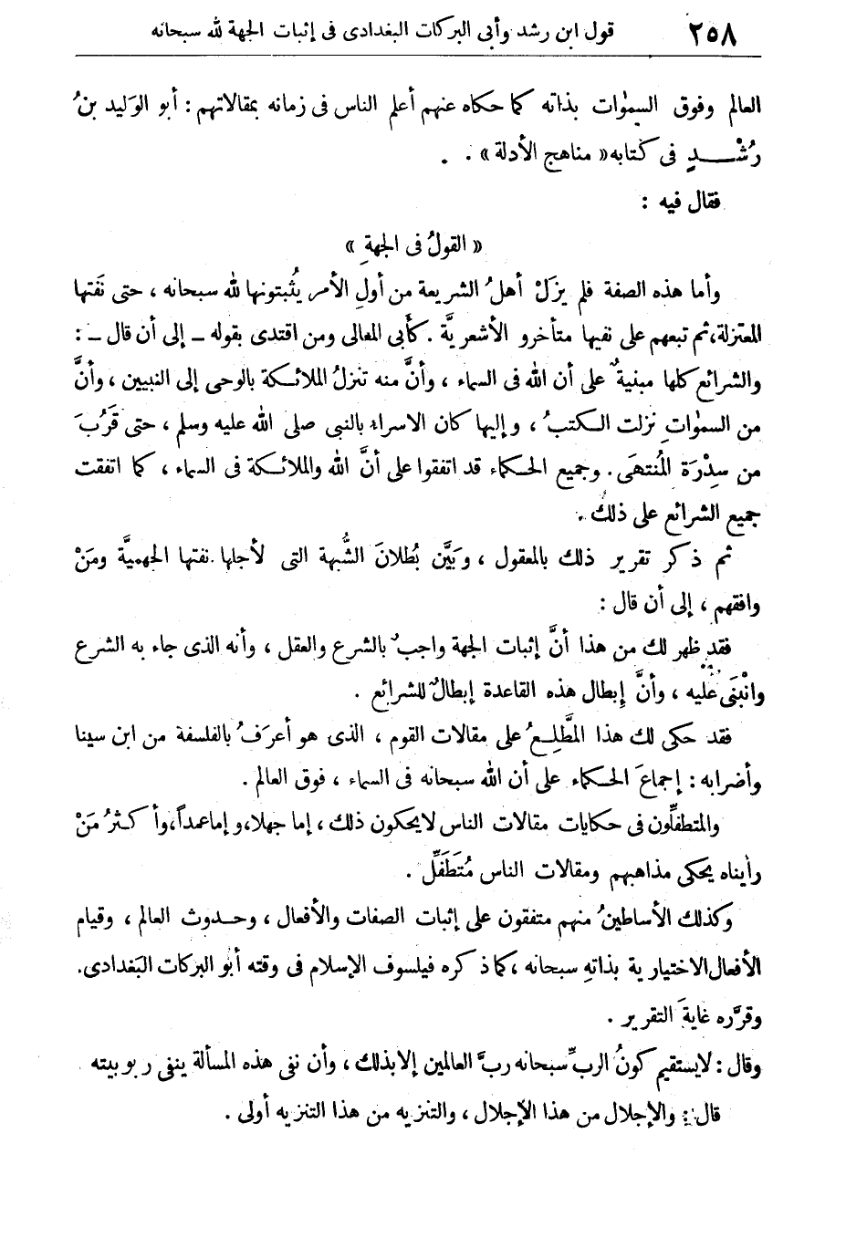 العالم وفوق السماوات بذاته كما حكاه عنهم أعلم الناس فى زمانه بمقالاتهم: أبو الوليد بن رشد فى كتابه "مناهج الأدلة".
