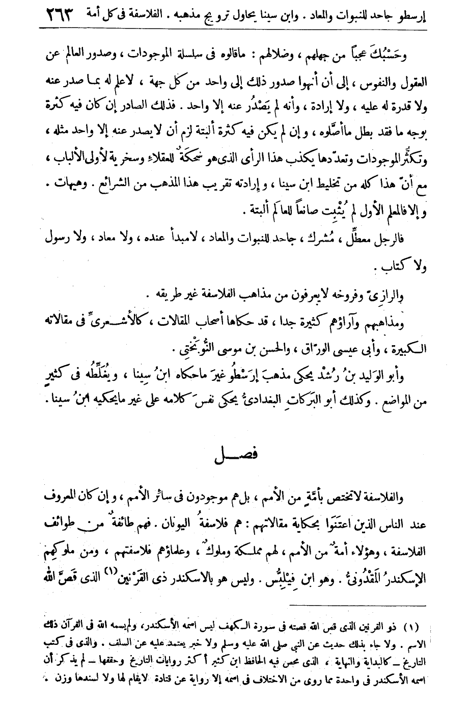 والفلاسفة لا تختص بأمة من الأمم، بل هم موجودون فى سائر الأمم، وإن كان المعروف عند الناس الذين اعتنوا بحكاية مقالاتهم: هم فلاسفة اليونان. فهم طائفة من طوائف الفلاسفة، وهؤلاء أمة من الأمم، لهم مملكة وملوك، وعلماؤهم فلاسفتهم، ومن ملوكهم الإسكندر المقدونى. وهو ابن فيلبس. وليس هو بالإسكندر ذى القرنين الذى قص الله