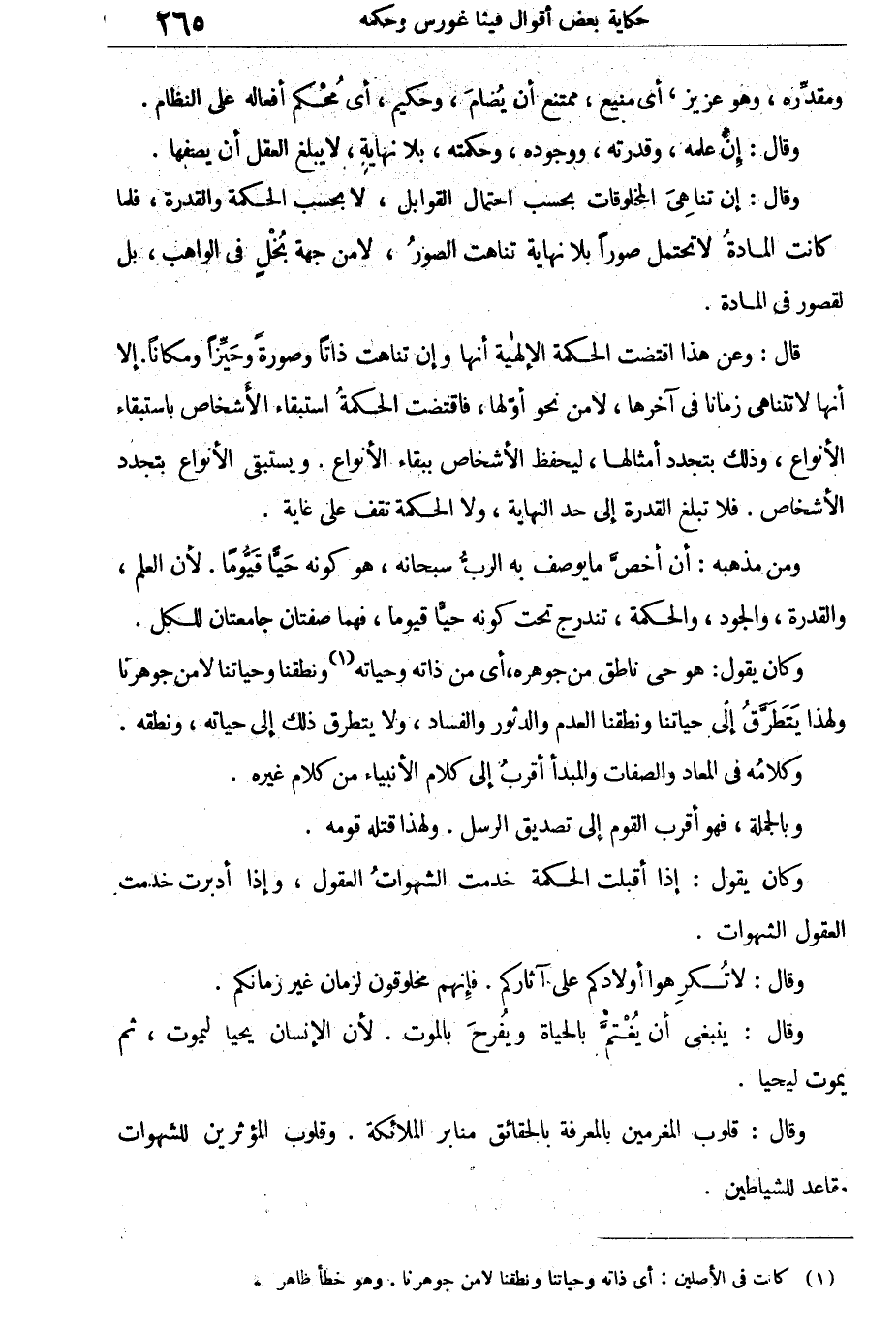 وكان يقول: هو حى ناطق من جوهره، أى من ذاته وحياته، ونطقنا وحياتنا لا من جوهرنا، ولهذا يتطرق إلى حياتنا ونطقنا العدم والدثور والفساد، ولا يتطرق ذلك إلى حياته ونطقه.