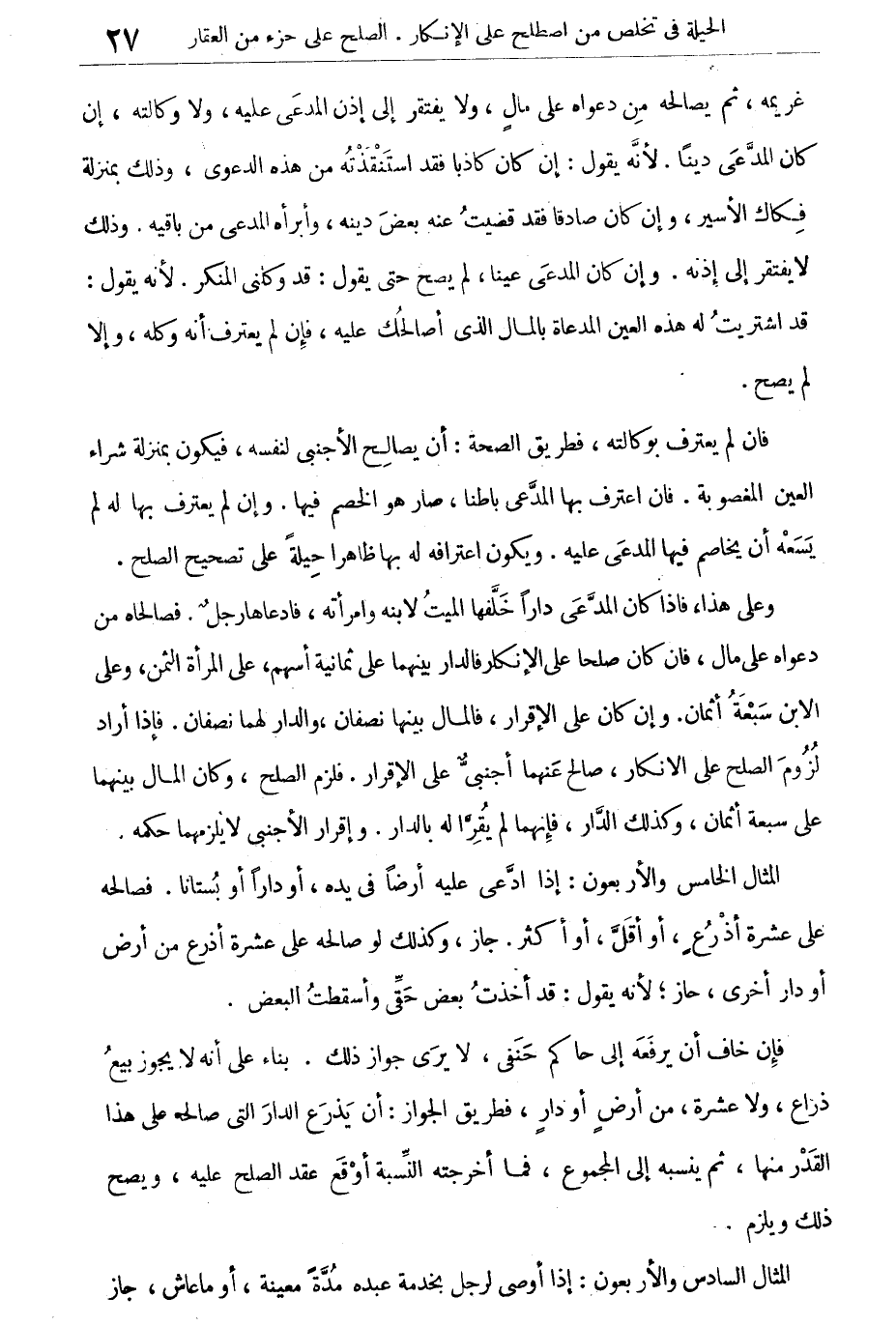 المثال الخامس والأربعون: إذا ادعى عليه أرضا فى يده، أو داراً أو بستانا. فصالحه على عشرة أذرع، أو أقل، أو أكثر، جاز، وكذلك لو صالحه على عشرة أذرع من أرض أو أخرى، جاز، لأنه يقول: قد أخذت بعض حقى وأسقطت البعض.