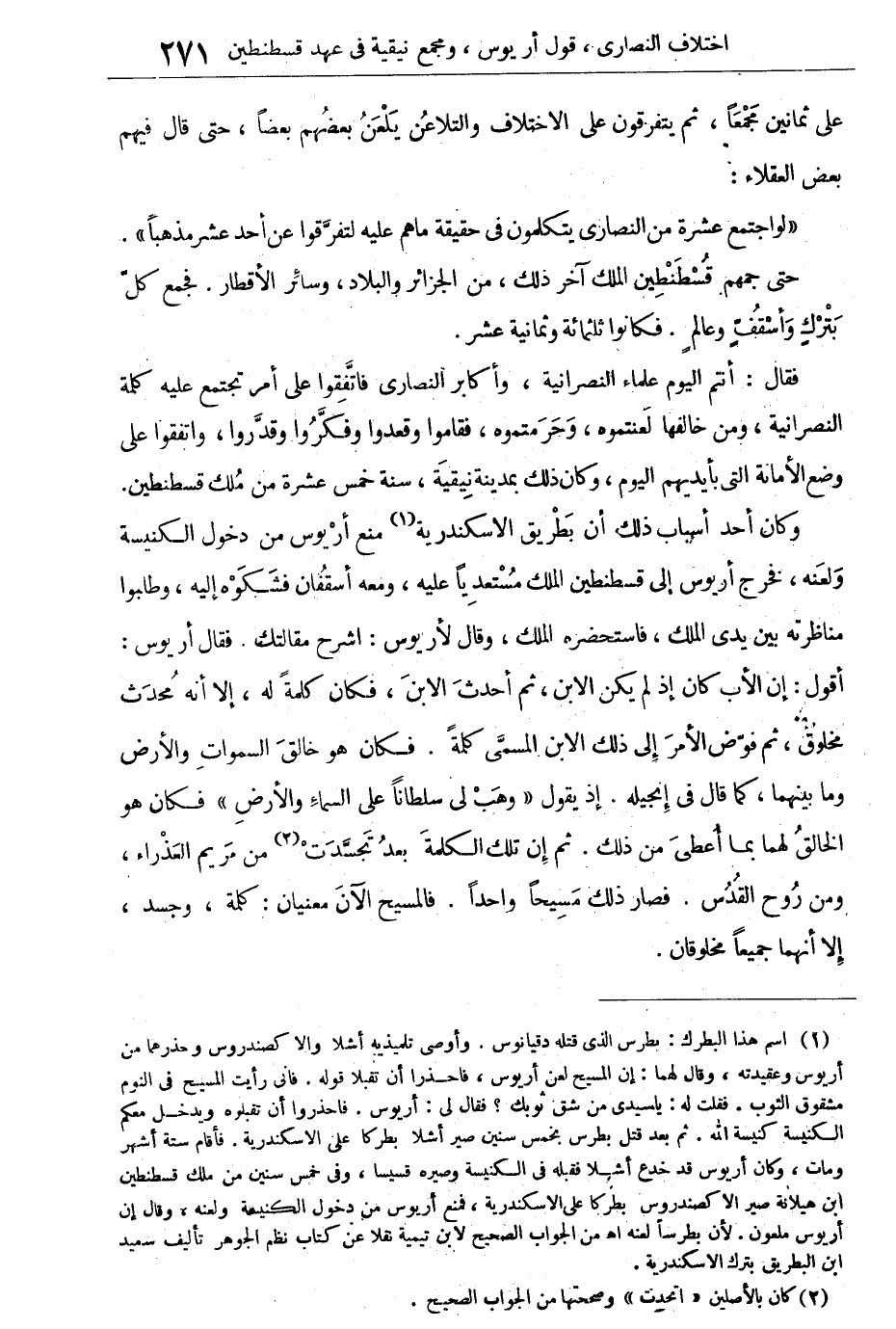 وكان أحد أسباب ذلك أن بطْريق الإسكندرية منع أريوس من دخول الكنيسة ولعنه، فخرج أريوس إلى قسطنطين الملك مستعديا عليه، ومعه أسقُفان فشكوه إليه، وطلبوا مناظرته بين يدى الملك، فاستحضره الملك، وقال لأريوس: اشرح مقالتك. فقال أريوس: أقول: إن الأب كان إذ لم يكن الابن، ثم أحدث الابن، فكان كلمة له، إلا أنه محدث مخلوق، ثم فوض الأمر إلى ذلك الابن المسمى كلمة. فكان هو خالق السماوات والأرض وما بينهما كما قال فى إنجيله، إذ يقول "وهب لى سلطانا على السماء والأرض" فكان هو الخالق لهما بما أعطى من ذلك. ثم إن تلك الكلمة بعد تجسدت من مريم العذراء ومن روح القدس. فصار ذلك مسيحا واحدا. فالمسيح الآن معنيان: كلمة، وجسد، إلا أنهما جميعا مخلوقان.