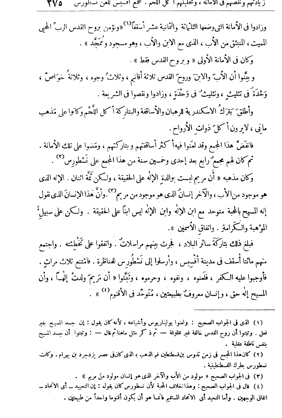 وبينوا أن الأب والابن وروح القدس ثلاثة أقانيم، وثلاث وجوه، وثلاثة خواص، وحدة فى تثليث وتثليث فى وحدة، وزادوا ونقصوا فى الشريعة.