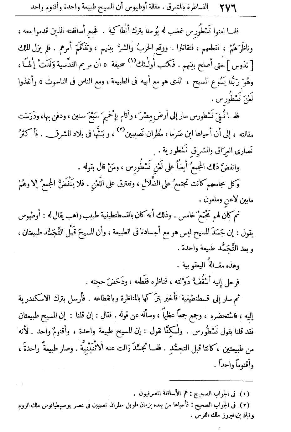 فلما لعنوا نسطورس غضب له يوحنا بترك أنطاكية. فجمع أساقفته الذين قدموا معه، وناظرهم، فقطعهم، فتقاتلوا. ووقع الحرب والشر بينهم، وتفاقم أمرهم. فلم يزل الملك [تذوس] حتى أصلح بينهم. فكتب أولئك صحيفة "أن مريم القدسية ولدت إلها، وهو ربنا يسوع المسيح، الذى هو مع أبيه فى الطبيعة، ومع الناس فى الناسوت" وأنفذوا لعن نسطورس.