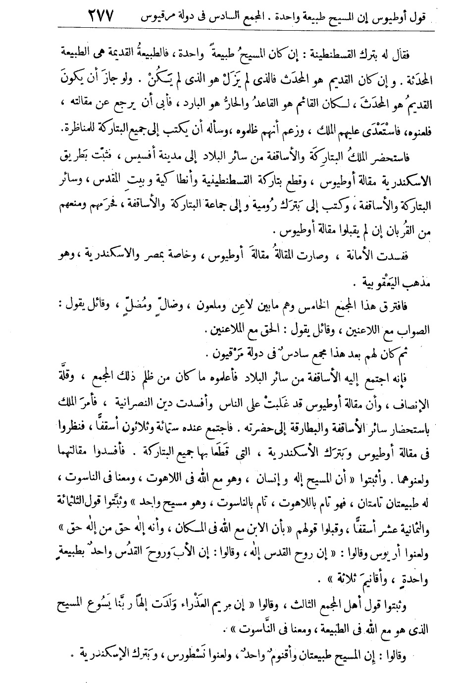 ثم كان لهم بعد هذا مجمع سادس فى دولة مرقيون فإنه اجمتع إليه الأساقفة من سائر البلاد فأعلموه ما كان من ظلم ذلك المجمع، وقلة الإنصاف، وأن مقالة أوطيوس قد غلبت على الناس وأفسدت دين النصرانية، فأمر الملك باستحضار سائر الأساقفة والبطارقة إلى حضرته. فاجتمع عنده ستمائة وثلاثون أسقفا، فنظروا فى مقالة أوطيوس وبترك الإسكندرية، التى قطعا بها جميع البتاركة. فأفسدوا مقالتهما ولعنوهما. وأثبتوا "أن المسيح إله وإنسان، وهو مع الله فى اللاهوت ومعنا فى الناسوت، له طبيعتان تامتان. فهو تام باللاهوت، تام بالناسوت، وهو مسيح واحد" وثبتوا قول الثلاثمائة والثمانية عشر أسقفا، وقبلوا قولهم "بأن الابن مع الله فى المكان، وأنه إله حق من إله حق" ولعنوا أريوس وقالوا: "إن روح القدس إله، وقالوا: إن الأب وروح القدس واحد بطبيعة واحدة، وأقانيم ثلاثة".