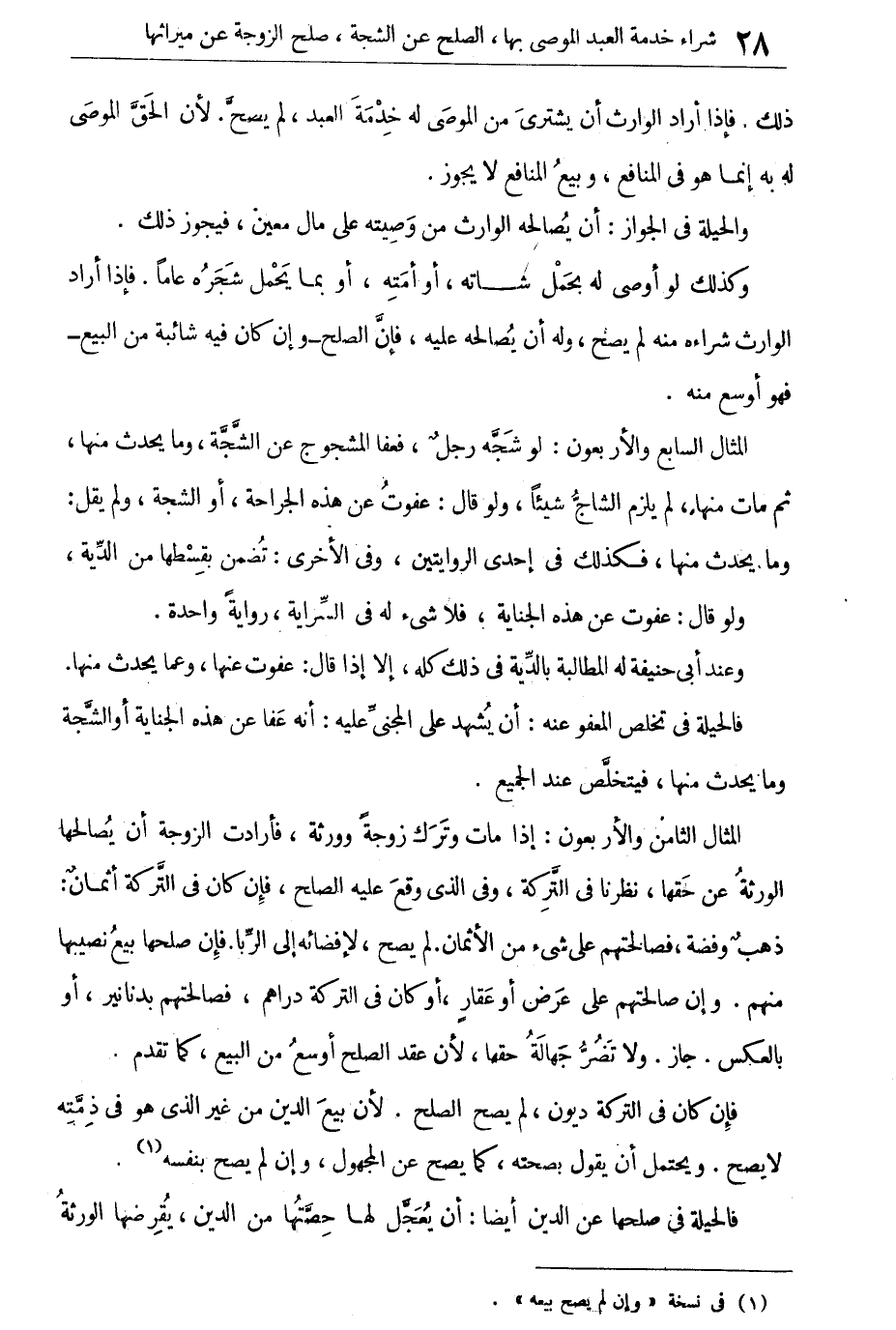 المثال الثامن والأربعون: إذا مات وترك زوجة وورثة، فأرادت الزوجة أن يصالحها الورثة عن حقها نظرنا فى التركة، وفى الذى وقع عليه الصلح، فإن كان فى التركة أثمان: ذهب وفضة، فصالحتهم على شئ من الأثمان لم يصح، لإفضائه إلى الربا. لأن صلحها بيع نصيبها منهم. وإن صالحتهم على عرض أو عقار، أو كان فى التركة دراهم، فصالحتهم بدنانير، أو بالعكس جاز. ولا تضر جهالة حقها، لأن عقد الصلح أوسع من البيع كما تقدم.