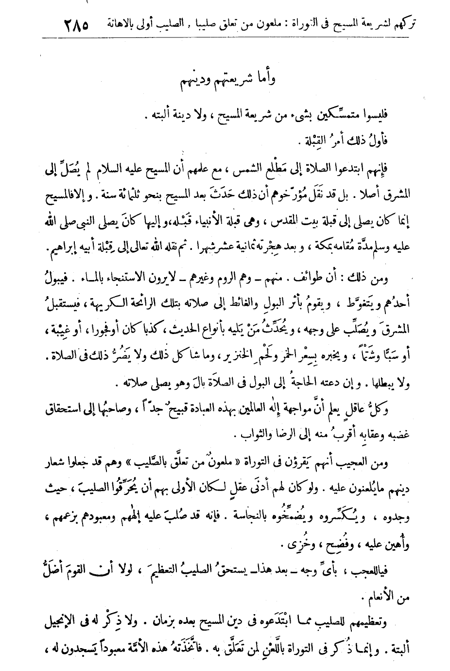 ومن العجيب إنهم يقرءون فى نص التوراة "ملعون من تعلق بالصليب" وهم قد جعلوا شعار دينهم ما يلعنون عليه. ولو كان لهم أدنى عقل لكان الأولى بهم أن يحرقوا الصليب، حيث وجدوه، ويكسروه ويُضمِّخُوه بالنجاسة. فإنه صلب عليه إلههم ومعبودهم بزعمهم، وأهين عليه، وفضح، وخزى.