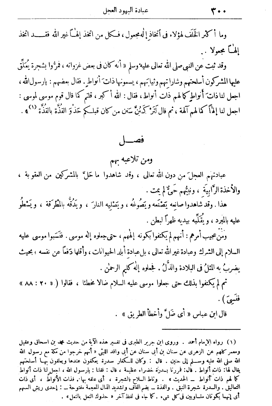 وقد ثبت عن النبى صلى الله تعالى عليه وسلم "أنه كان فى بعض غزواته، فمروا بشجرة يعلق عليها المشركون أسلحتهم وشاراتهم وثيابهم، يسمونها ذات أنواط. فقال بعضهم: يا رسول الله، اجعل لنا ذات أنواط كما لهم ذات أنواط، فقال: الله أكبر، قلتم كما قال قوم موسى لموسى: اجعل لنا إلها كما لهم آلهة، ثم قال: لتركبنّ سنن من كان قبلكم حذو القذة بالقذة".