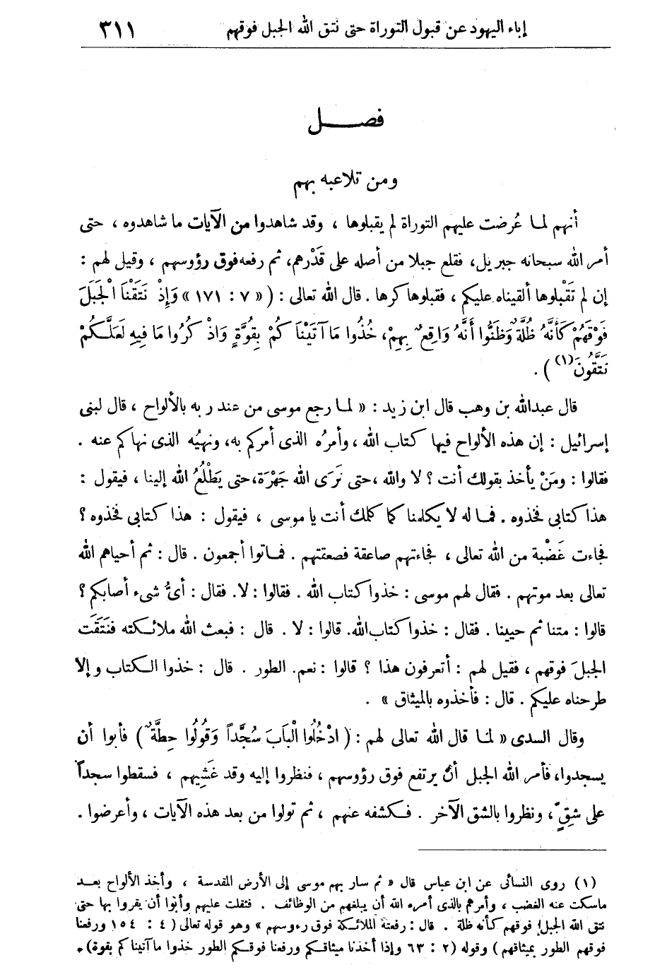 قال عبد الله بن وهب قال ابن زيد: لما رجع موسى من عند ربه بالألواح، قال لبنى إسرائيل: إن هذه الألواح فيها كتاب الله، وأمره الذى أمركم به، ونهيه الذى نهاكم عنه. فقالوا: ومن يأخذ بقولك أنت؟ لا والله، حتى نرى الله جهرة، حتى يطلع الله إلينا، فيقول: هذا كتابى فخذوه. فما له لا يكلمنا كما كلمك أنت يا موسى، فيقول: هذا كتابى فخذوه؟ فجاءت غضبة من الله تعالى. فجاءتهم صاعقة فصعقتهم فماتوا أجمعون. قال: ثم أحياهم الله تعالى بعد موتهم. فقال لهم موسى: خذوا كتاب الله. فقالوا: لا. فقال: أى شيء أصابكم؟ قالوا: متنا ثم حيينا. فقال: خذوا كتاب الله. قالوا: لا. قال: فبعث الله ملائكته فنتقت الجبل فوقهم، فقيل لهم: أتعرفون هذا؟ قالوا: نعم، الطور. قال: خذوا الكتاب وإلا طرحناه عليكم. قال: فأخذوه بالميثاق.