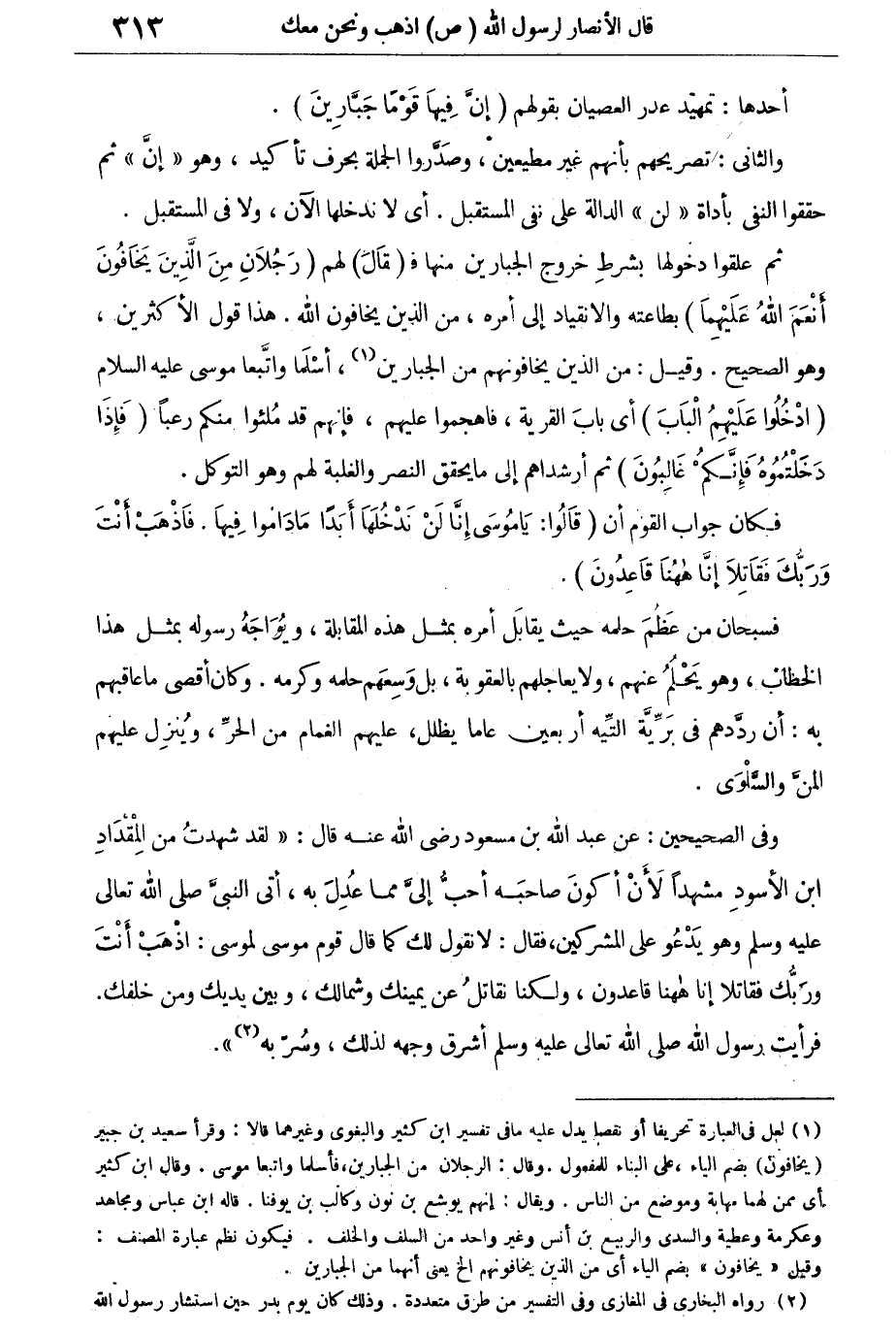 وفى الصحيحين: عن عبد الله بن مسعود رضى الله عنه قال: "لقد شهدت من المقداد بن الأسود مشهدا لأن أكون صاحبه أحب إلى مما عدل به، أتى النبى صلى الله تعالى عليه وسلم وهو يدعو على المشركين، فقال: لا نقول لك كما قال قوم موسى لموسى: اذهب أنت وربك فقاتلا إنا هاهنا قاعدون، ولكنا نقاتل عن يمينك وشمالك، وبين يديك ومن خلفك. فرأيت رسول الله صلى الله تعالى وسلم أشرق وجهه لذلك وسر به".